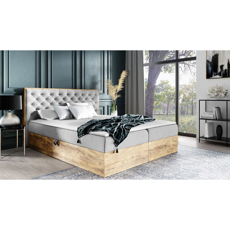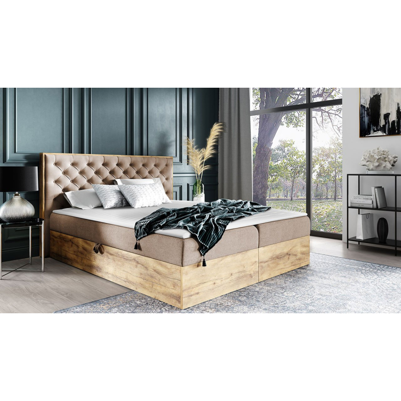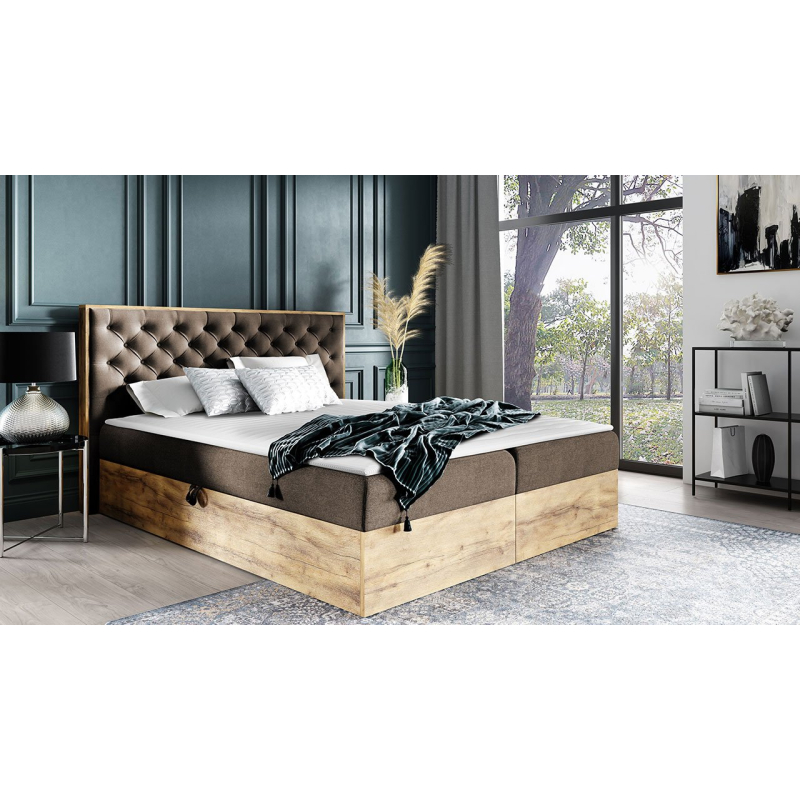 Elegantní vzhled postele vytvářejí pečlivě vybrané komponenty. Základnu se vzorem dřeva doplňují čalouněné vložky. Čalounění matrace a dekorativně prošívané čelo jsou prvky, které podtrhují výjimečný vzhled celého nábytku. Z široké nabídky barev čalounění si můžete vybrat tu, která se nejlépe hodí k interiéru vaší ložnice.
