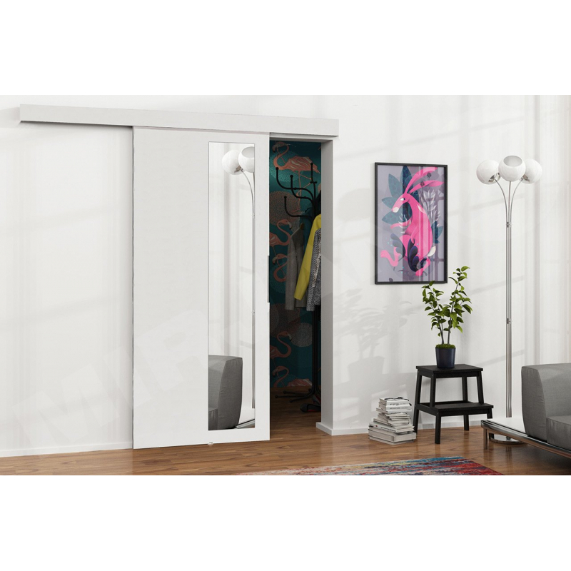 Vnitřní posuvné dveře Mereno III 80 upřednostňují optimální využití prostoru v bytě. Díky takovým dveřím můžete esteticky oddělit místnosti od sebe, například předsíň od obývacího pokoje, nebo oddělit prostor v ložnici pro váš vysněný šatník. Zrcadlo zdobící přední část dveří má kromě dekorativní hodnoty také praktickou funkci - opticky zvětšuje prostor. Nástěnné dveře jsou vyrobeny z laminované desky odolné vůči poškrábání a poškození, díky čemuž se budete moci dlouho těšit z jejich bezvadného vzhledu.