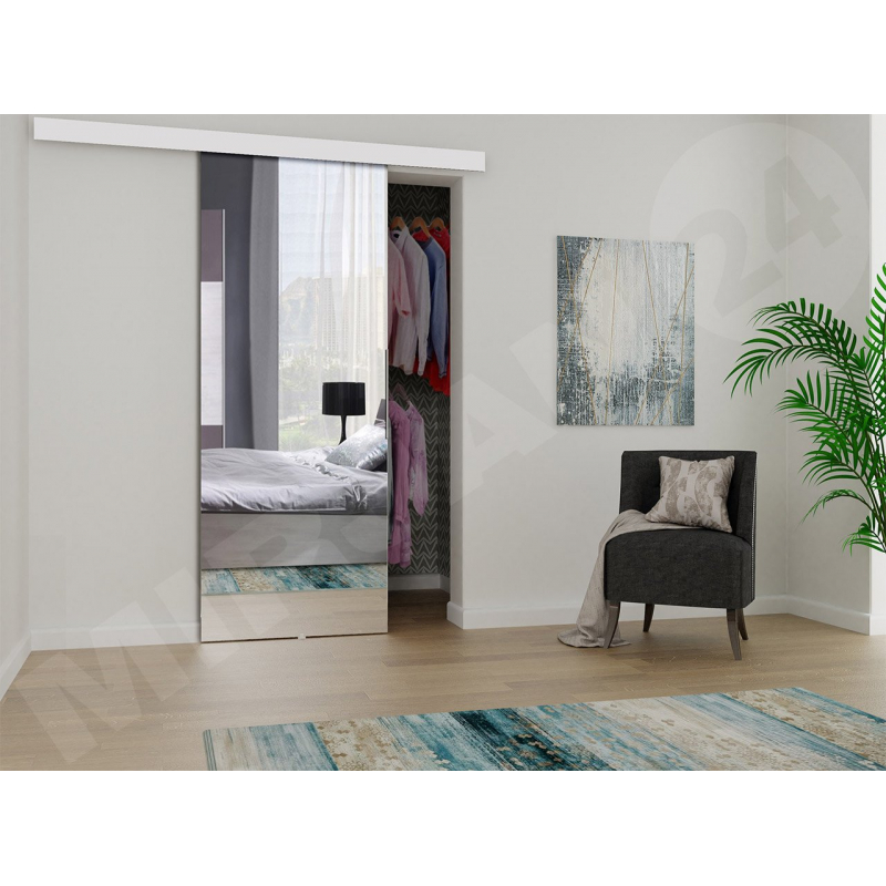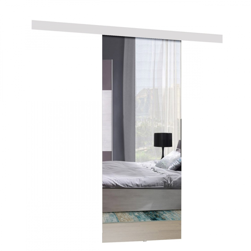 Nástěnné dveře Hello 80 jsou zajímavým a praktickým řešením pro oddělení dvou místností od sebe nebo pro oddělení šatny v ložnici. Dvířka jsou vyrobena z laminované desky a jejich vrchní strana je zrcadlová o tloušťce 3 cm. Posuvné dveře probíhají podél vedení ukrytého za maskovacím rámem. Rozměry dveří jsou šířka 86 cm a výška 205 cm.