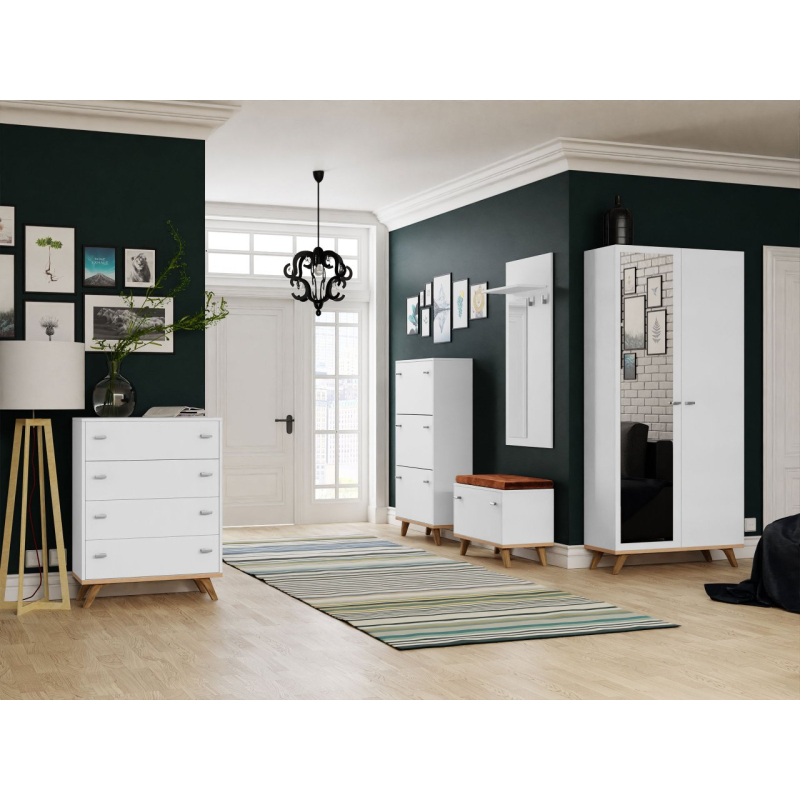 Sada obsahuje 5 prvků, které dokonale zaplňují prostor haly. Prvním prvkem je skříň se sklopnými dveřmi. Na přední straně šatníku je velké zrcadlo, které zvětšuje prostor. Uvnitř šatníku se však nachází několik polic a bar pro věšáky.