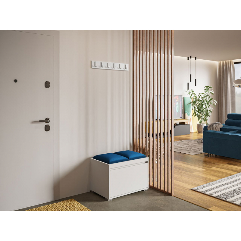 Malá skříňka na boty se sedadlem je praktickým úložným prostorem a pohodlnou oporou při přezouvání v jednom. Přiložený věšák zase poslouží k zavěšení bundy, kabátu a kabelky.