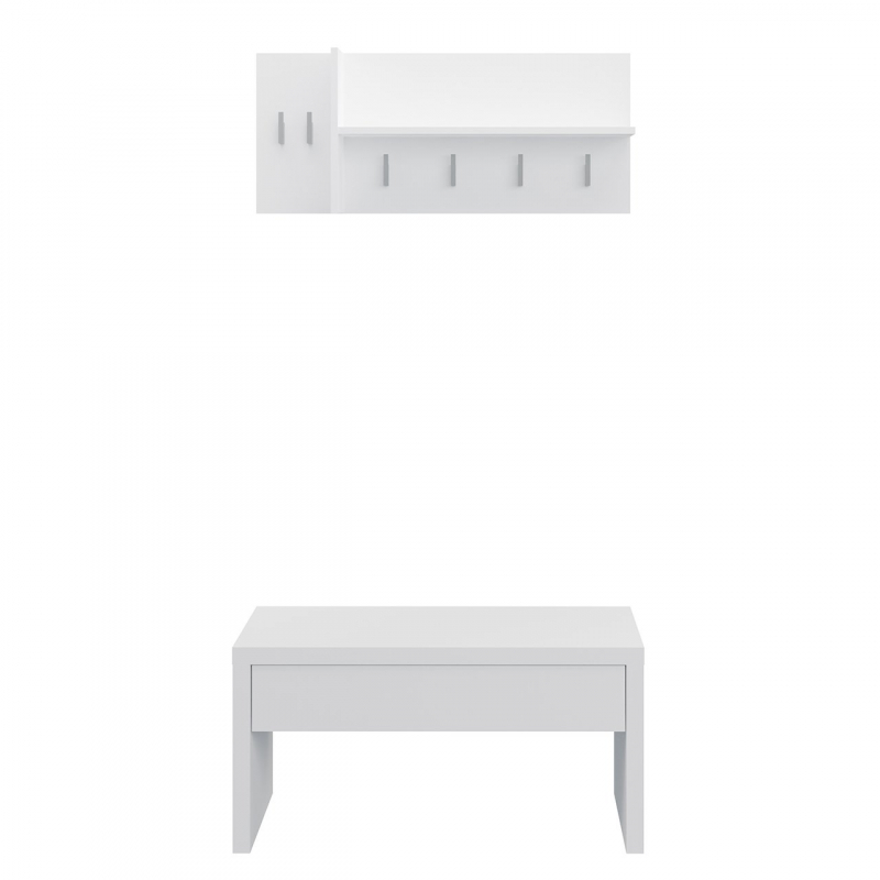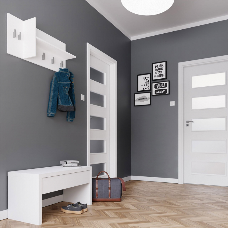 Prezentovaný šatník obsahuje závěsný panel s háčky na bundy a poličku na kšiltovky nebo kabelky. Spodní část sestavy tvoří lavice vybavena praktickým šuplíkem. Pohodlné otevírání zásuvky je možné díky částečnému výsuvnému posuvníku.