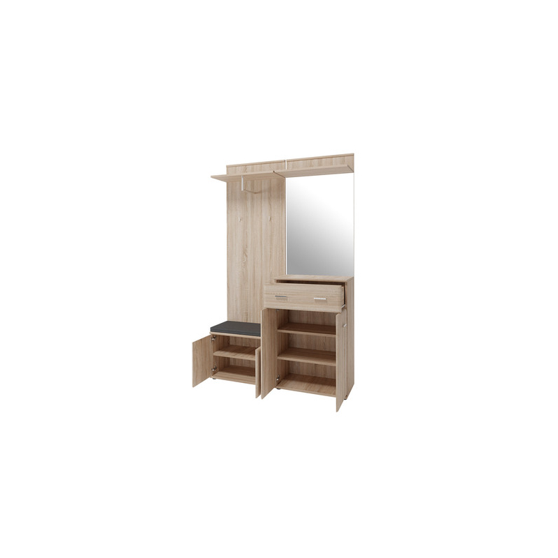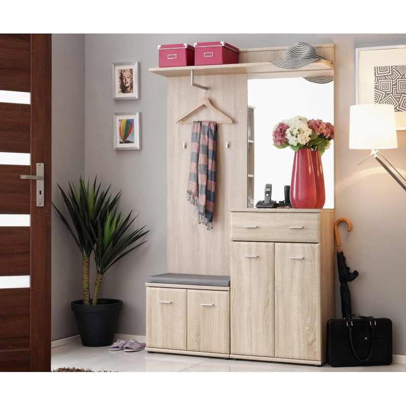 Jedná se o praktickou a funkční halovou soupravu, která nabízí dostatek prostoru pro uložení bot a drobných oděvů. Skříň se skládá z několika samostatných prvků. Prvním je botník se sedadlem v podobě pohodlného polštáře. Boty můžete schovat i do druhého, o něco vyššího šatníku, který má navíc zásuvku.