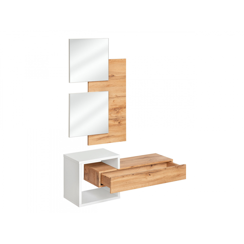 Máte malou předsíň? Máme pro Vás zajímavý návrh, který dodáva charakter a funkčnost - předsín Caleb! Předsíň se skládá ze dvou prvků. První je závěsný obdélníkový panel, který je spojen se dvěma zrcadly ve tvaru čtverce. Společně vytvářejí zajímavou nástěnnou výzdobu. Druhým prvkem je závěsná skříňka, která se skládá z otevřené obdélníkové police a zásuvky. Zásuvku můžete otevřít pomocí systému PUSH TO OPEN.
