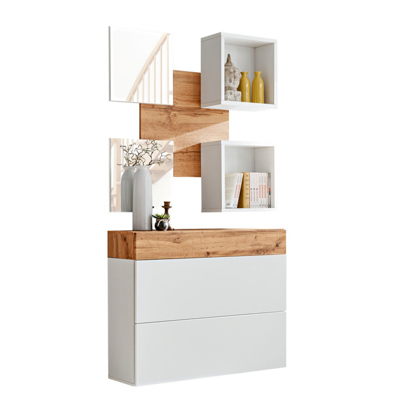 Prvním je závěsný nástěnný panel, který je spojen se dvěma zrcadly a čtvercovými policemi. Celý vypadá originální a představuje zajímavý dekorativní akcent na stěně. Druhým prvkem je závěsná skříňka, která je ideální pro uložení bot nebo sezónních čepic či tašek. Skříňka má dvě uzavřené police a zásuvku. Na jejich otevření slouží systém PUSH TO OPEN.