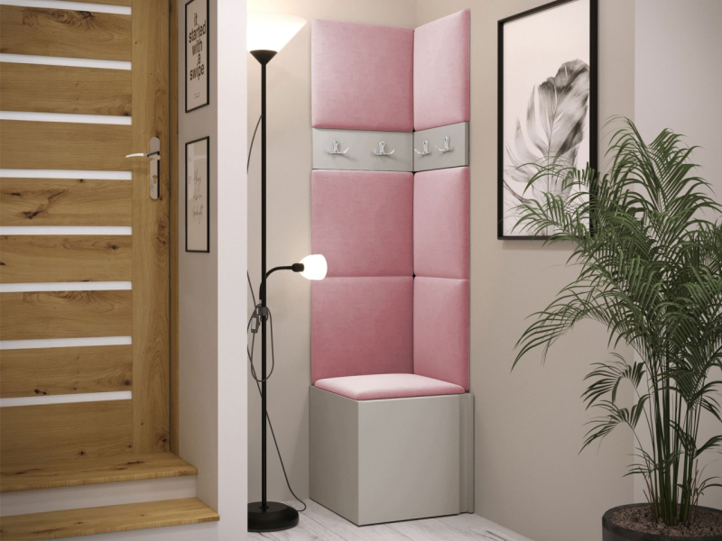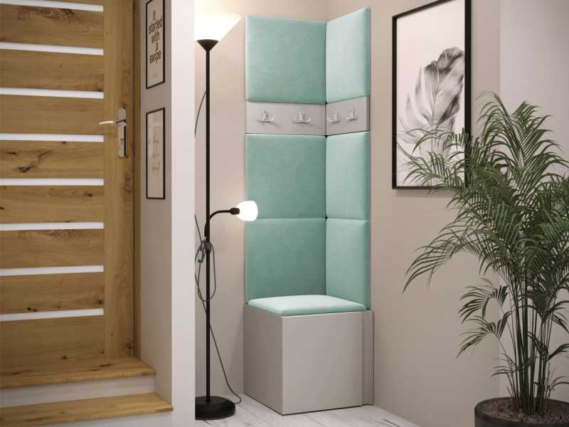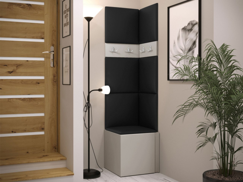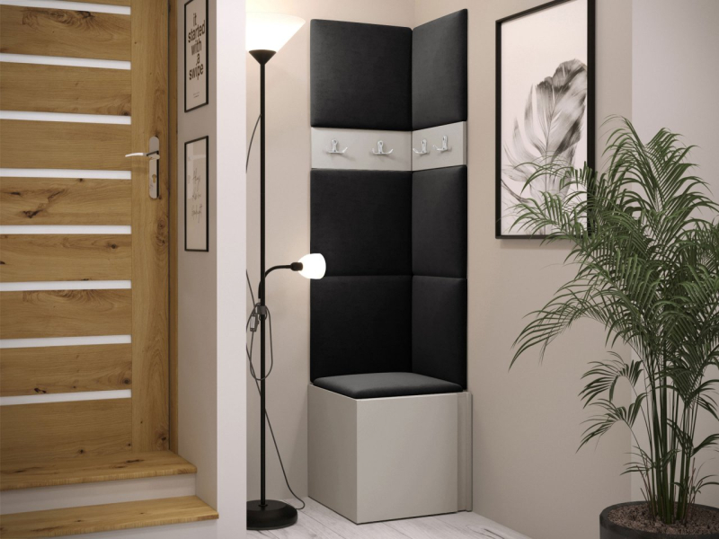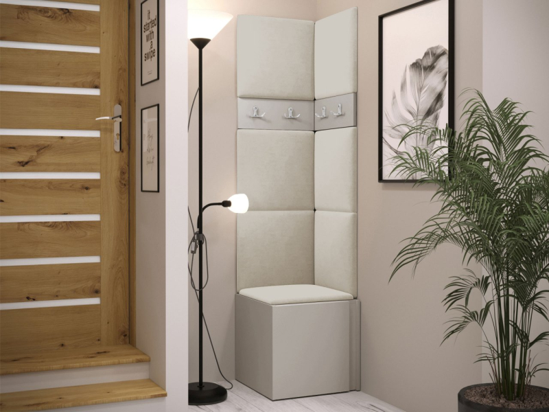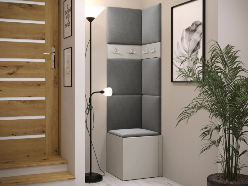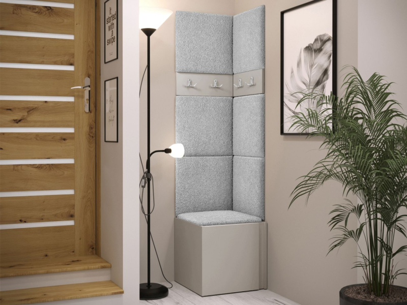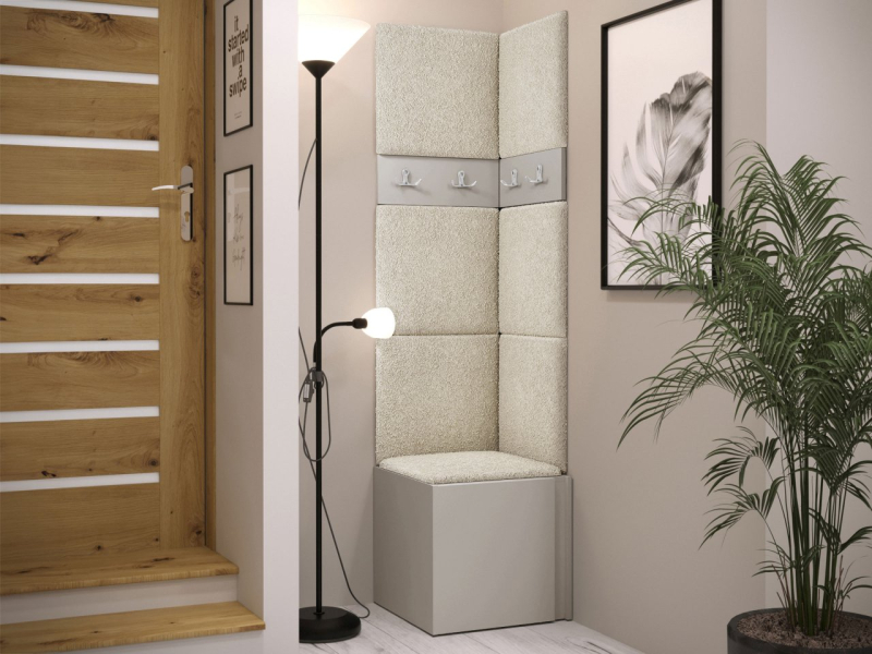 Tento model se skládá ze tří prvků. Základem je botník. V šatně jsou také věšáky na šaty. Celek doplňují čalouněné panely, které kromě dekorační vrstvy chrání stěnu i proti poškození a mají zvukově pohlcující vlastnosti. Model je vyroben z pevných materiálů. Bez úchytů.