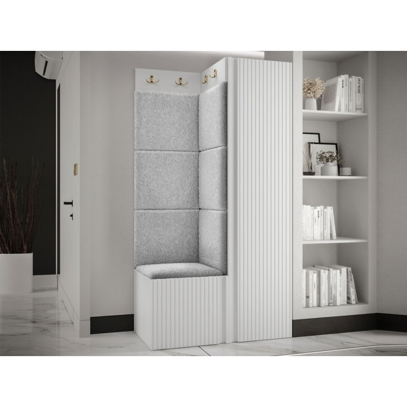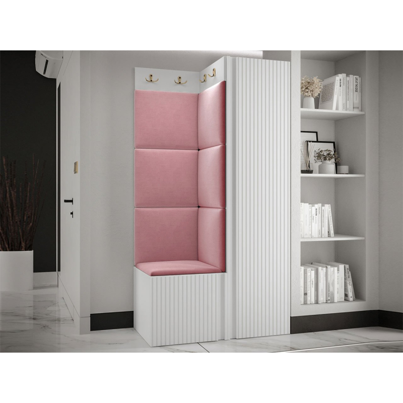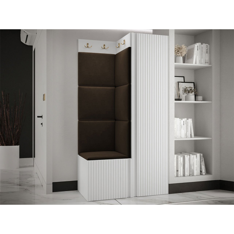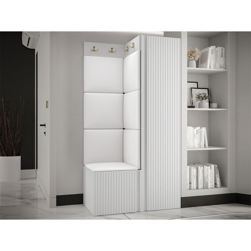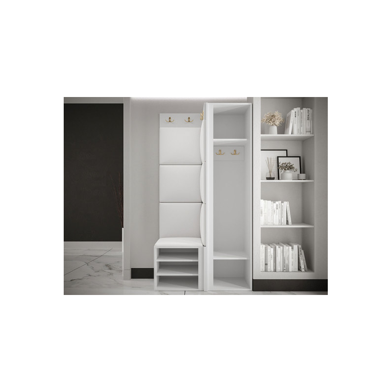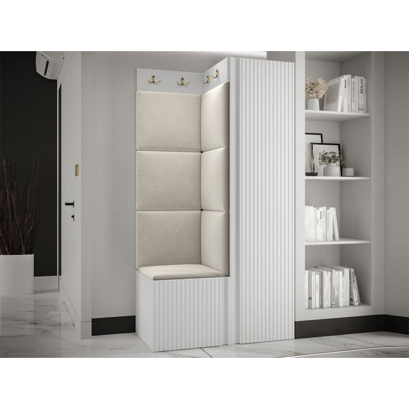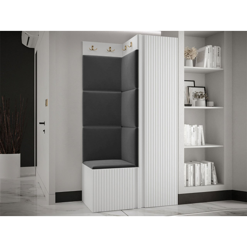 V sestavě je kromě jednodveřové skříně i botník se sedákem a panel s věšáky. Dekorativní vlastnosti haly zdůrazňují čalouněné panely. Kostky připevněné na zeď jsou módním doplňkem dekorace. Pomocí jejich praktických úprav ochráníte stěny i před nečistotami a poškozením.