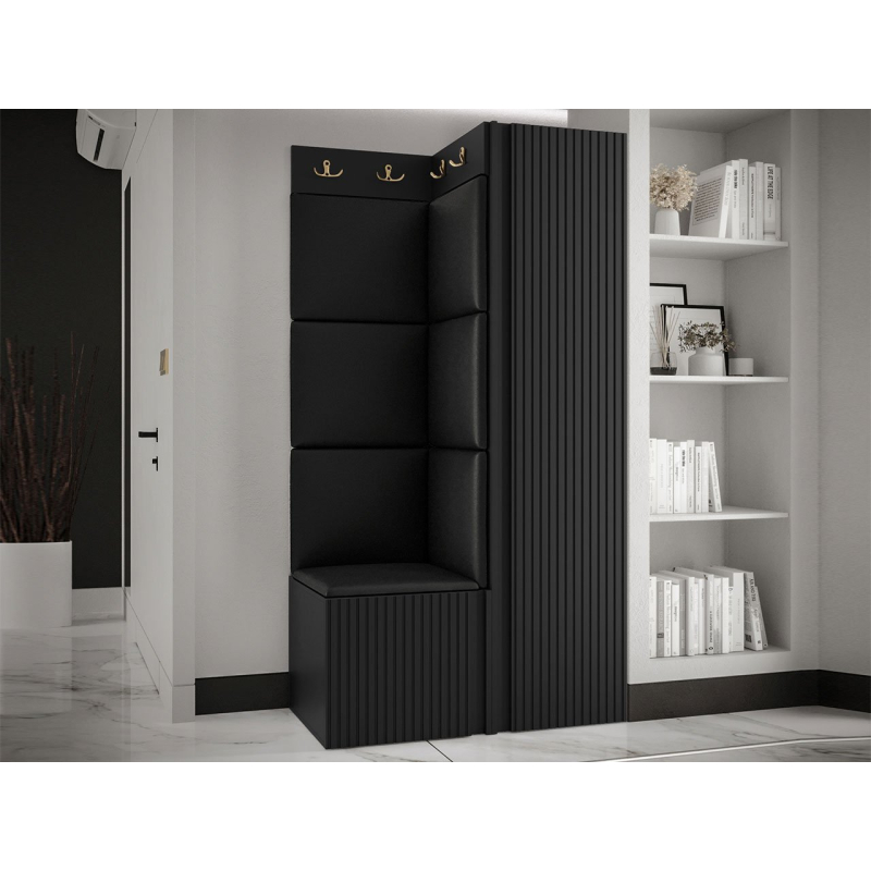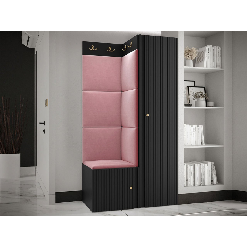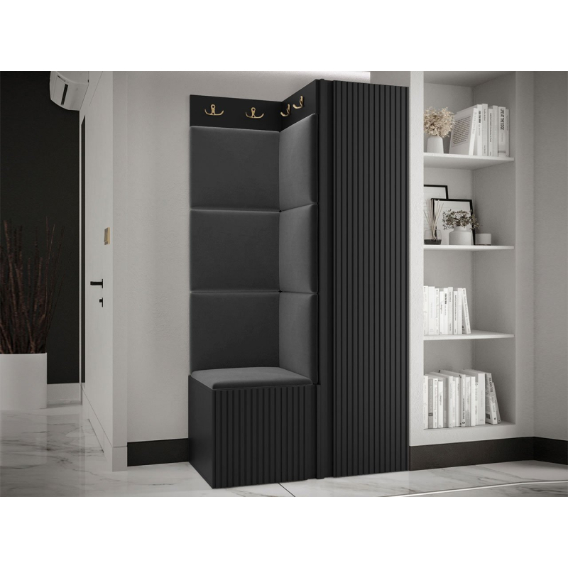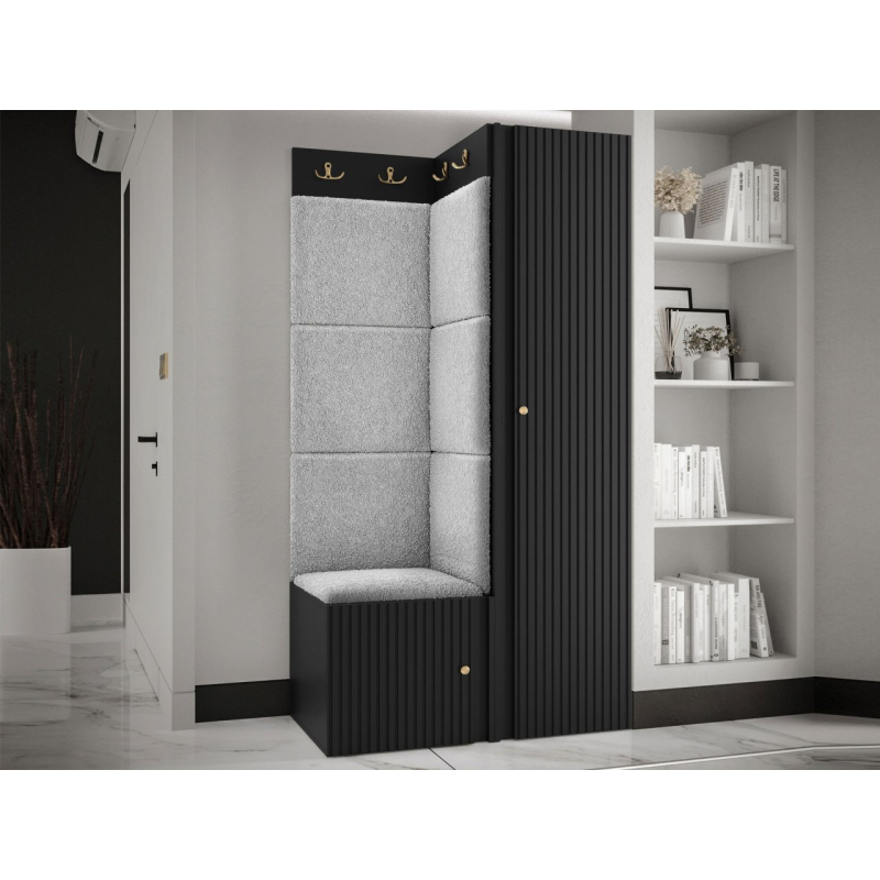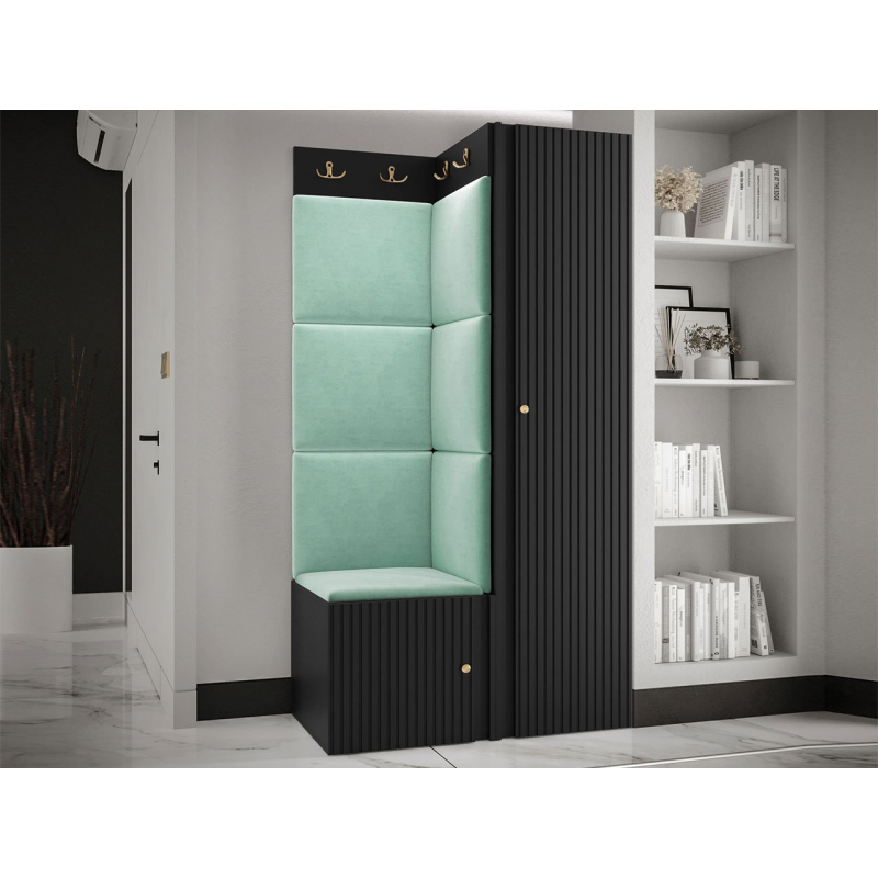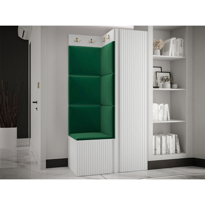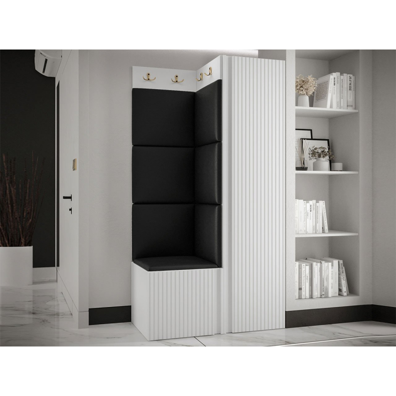 V sestavě je kromě jednodveřové skříně i botník se sedákem a panel s věšáky. Dekorativní vlastnosti haly zdůrazňují čalouněné panely. Kostky připevněné na zeď jsou módním doplňkem dekorace. Pomocí jejich praktických úprav ochráníte stěny i před nečistotami a poškozením.
