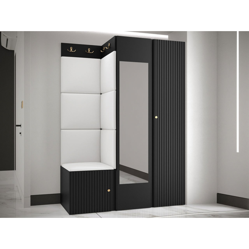 Nábytek je zdoben ozdobnými frézami a zlatými detaily, které dodávají mini šatníku jedinečný vzhled. Možnost výběru barvy čalouněných panelů vám umožní vytvořit jedinečný vzhled místnosti a kapacita šatníku jistě pojme vaše svrchní oblečení. Sestava má také velké zrcadlo – svůj styling si můžete vždy před odchodem vyfotit a zjistit, jestli vypadáte dobře.