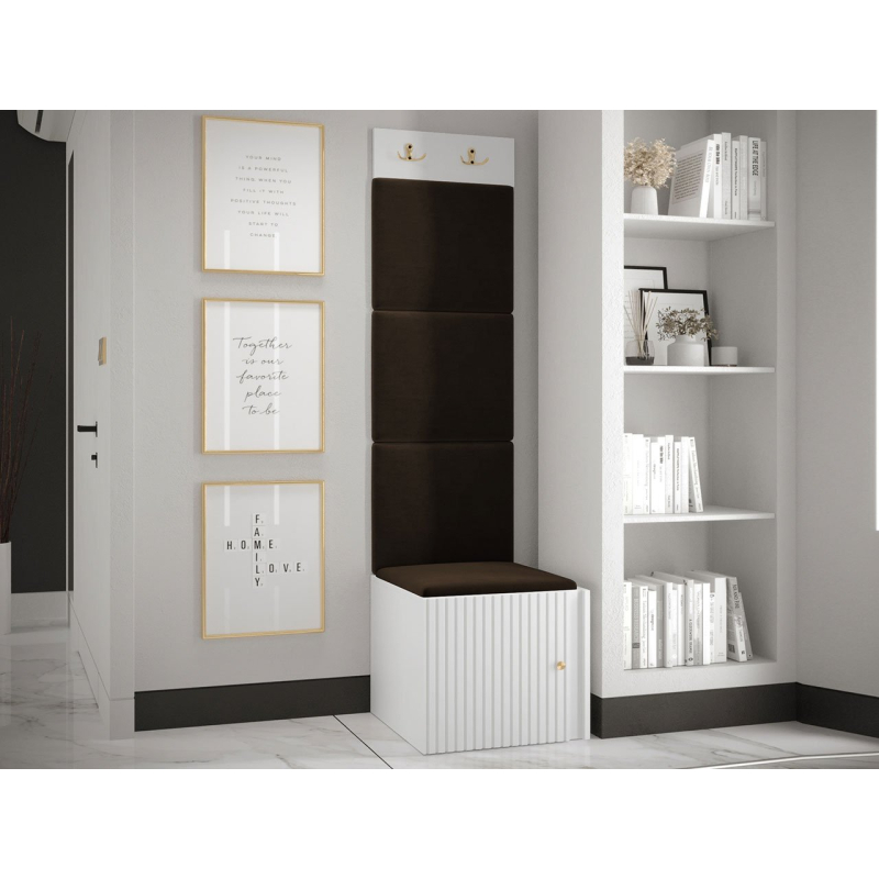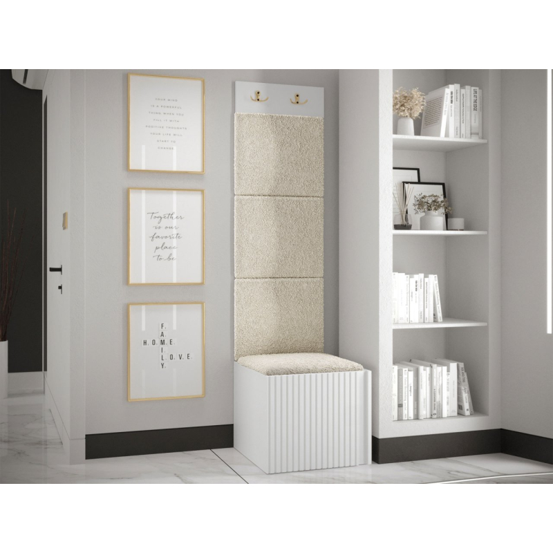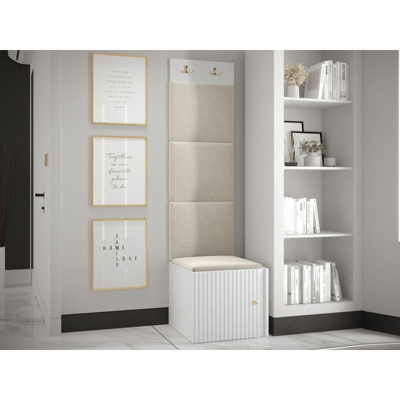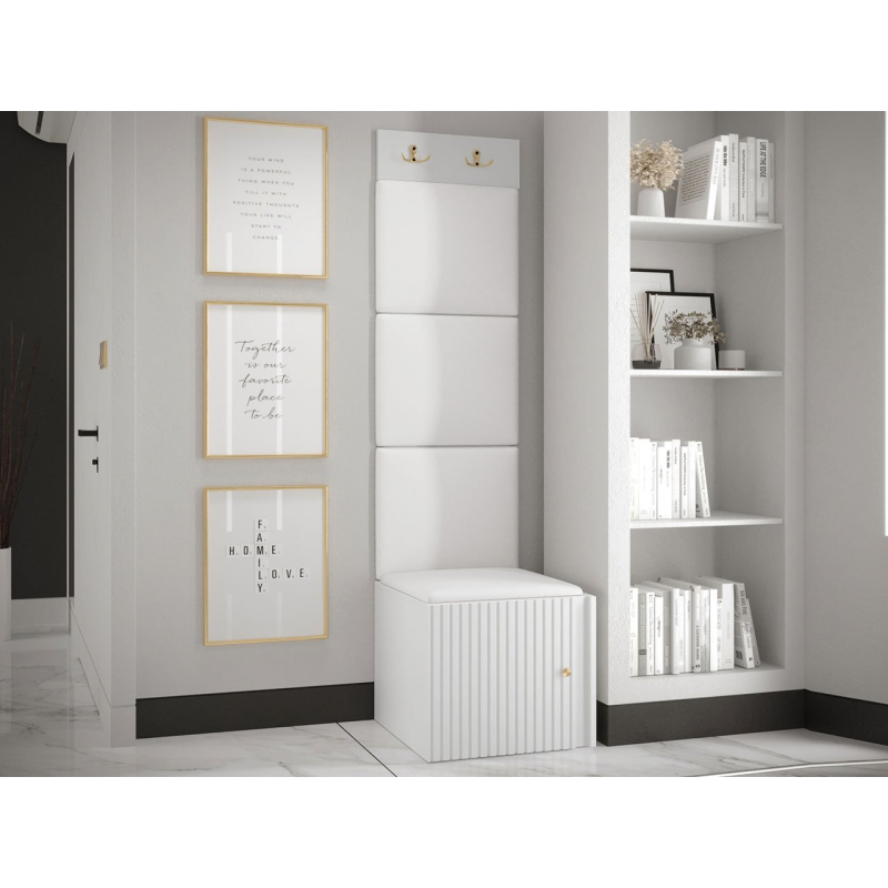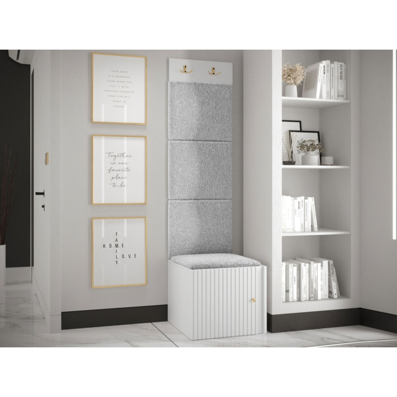 Předsíňová skříň se sedákem je zároveň prostorným botníkem a dvěma dvojitými věšáky. Kompaktní velikosti vám umožní zařídit i nejmenší vstupní halu módním a zajímavým způsobem. Rozlišovacím prvkem je frézovaná přední strana zakončená jemným zlatým úchytem.
