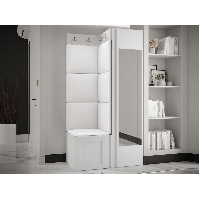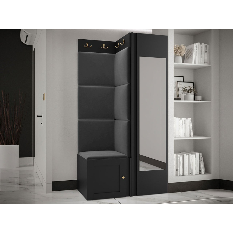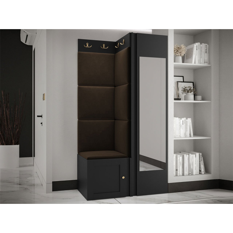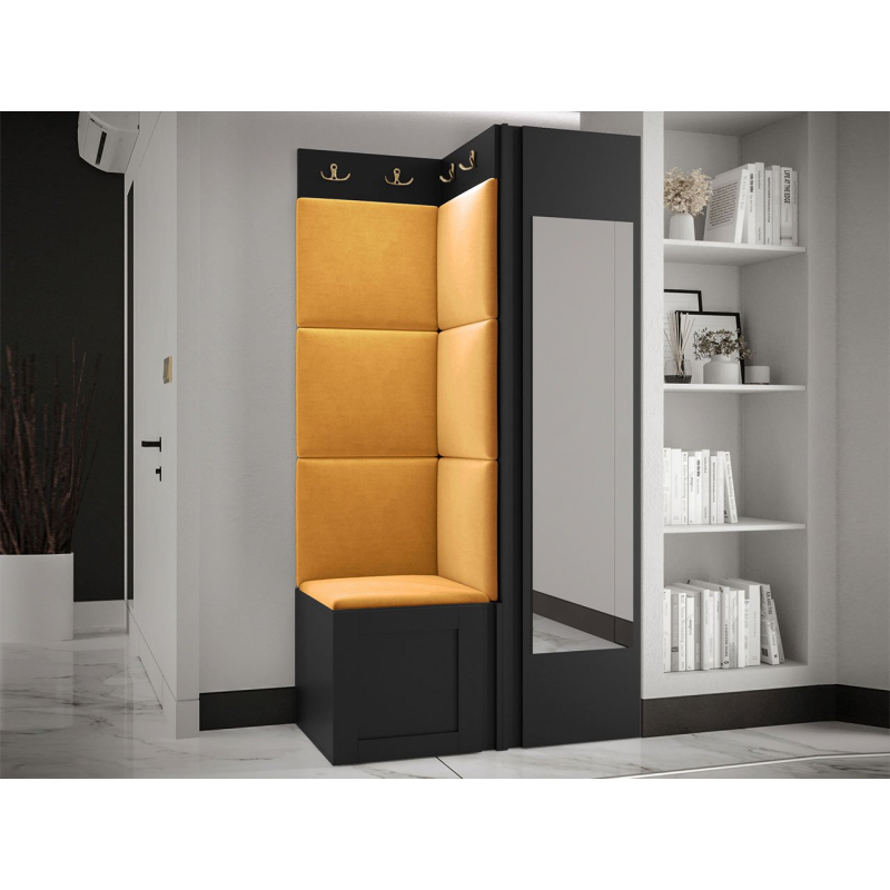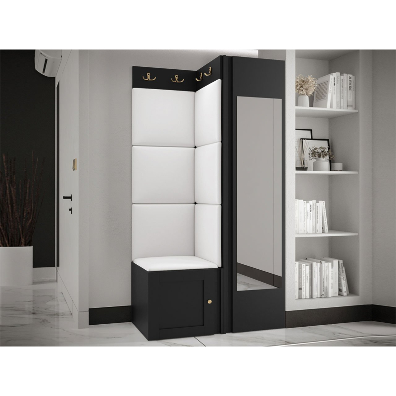 Pozoruhodné jsou zlaté prvky a měkké čalouněné panely. Do interiéru vnesou mimořádnou útulnost a extra pohodlí. Pohodlné sedadlo je prostor pro obouvání nebo zouvání. Hned pod ním je místo pro boty. Skříň se zrcadlem je klíčovým prvkem šatníku. Vybaven dvěma dvojitými věšáky vytvoří prostor pro kabáty všech členů domácnosti.
