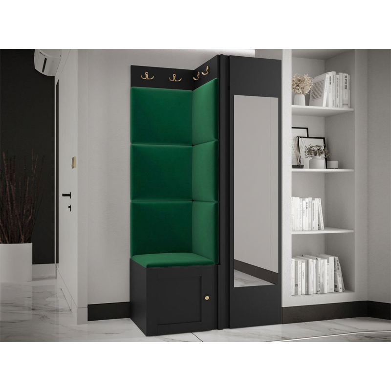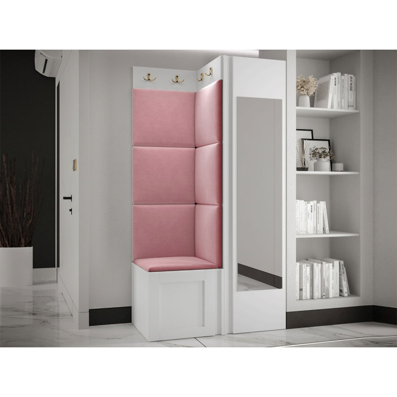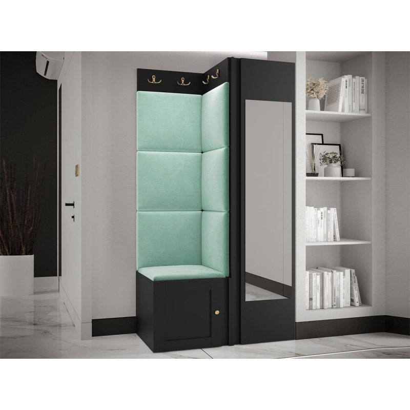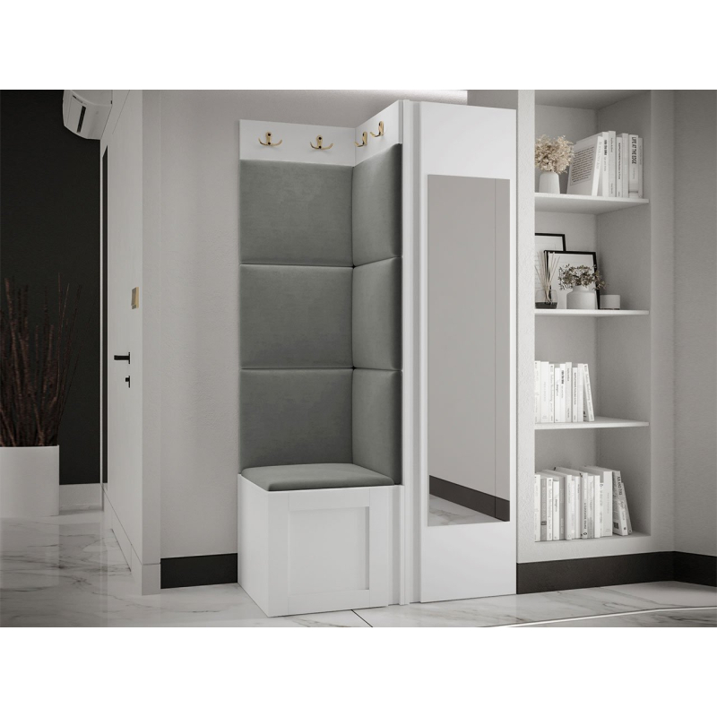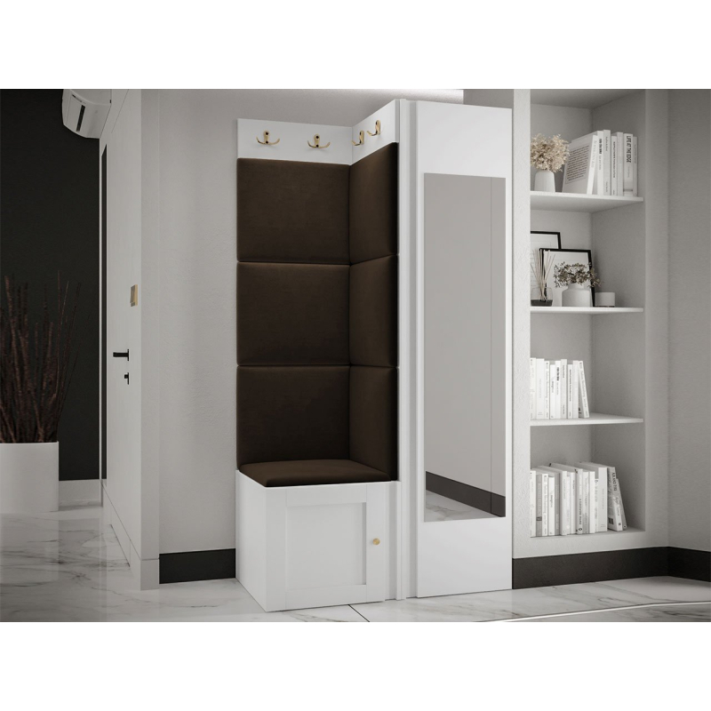 Pozoruhodné jsou zlaté prvky a měkké čalouněné panely. Do interiéru vnesou mimořádnou útulnost a extra pohodlí. Pohodlné sedadlo je prostor pro obouvání nebo zouvání. Hned pod ním je místo pro boty. Skříň se zrcadlem je klíčovým prvkem šatníku. Vybaven dvěma dvojitými věšáky vytvoří prostor pro kabáty všech členů domácnosti.