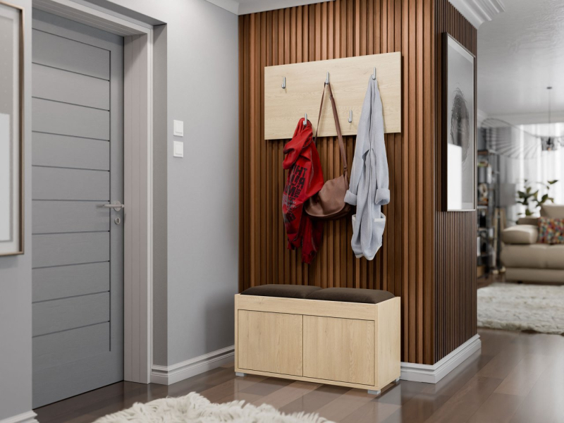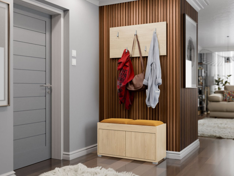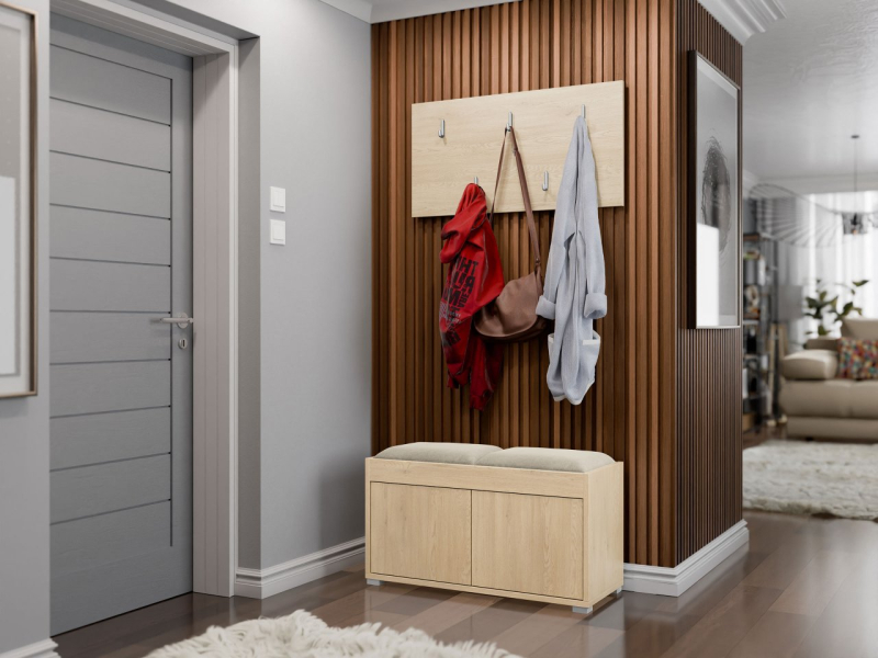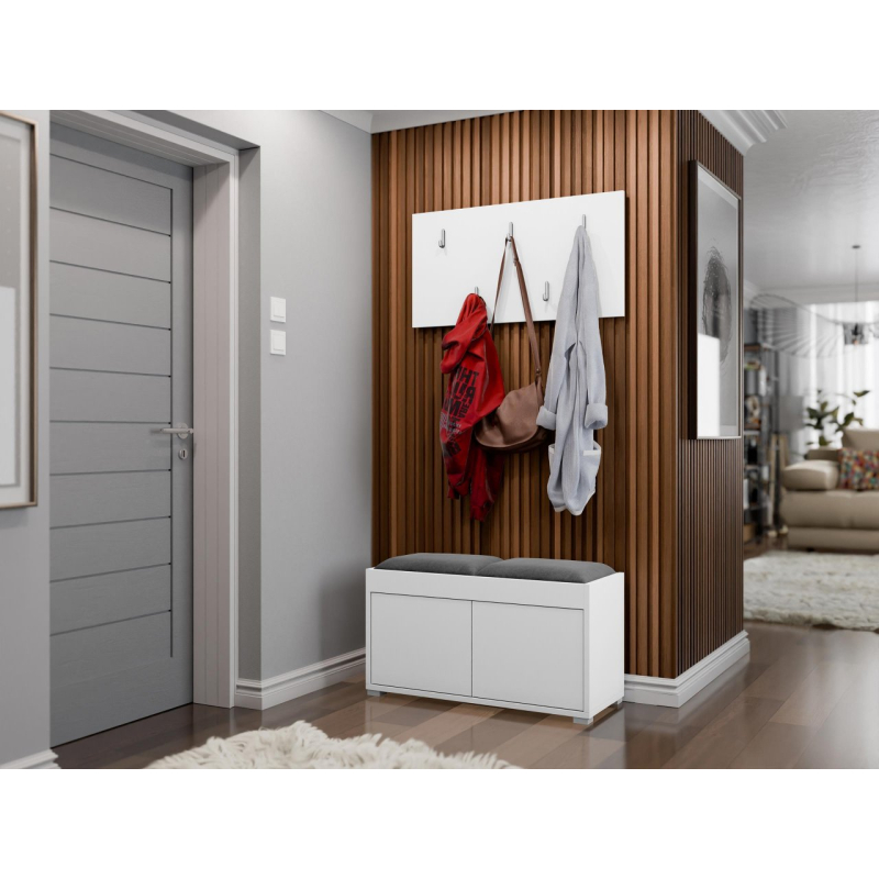 Malý pokoj není problém. Se šatní skříní s posezením Alekto VII vytvoříte praktickou předsíň. Součástí je botník, věšák na šaty a čalouněný panel. Tato malá sada vám pomůže uspořádat prostor, který vás jako první přivítá doma.
