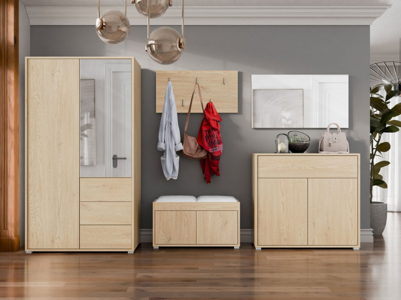 Funkční uspořádání každého interiéru je nesmírně důležité. Dnes bychom vám rádi navrhli předsíňovou sestavu Alekto V Tato víceprvková sestava udělá místnost praktickou a dekorativní. Najdete tam: komodu, zrcadlo, šatní skříň, věšák, botník a čalouněný panel.