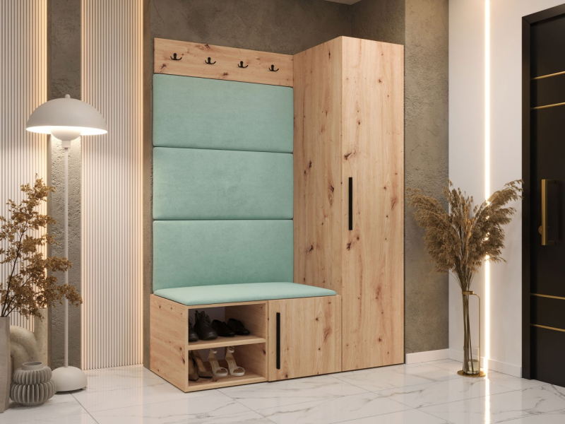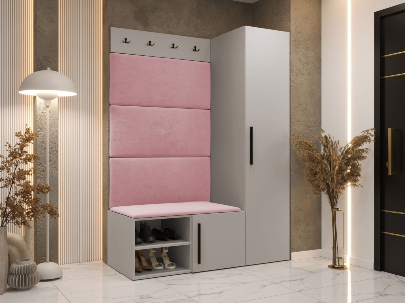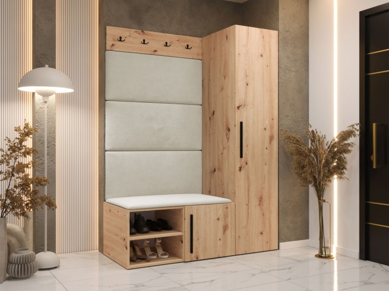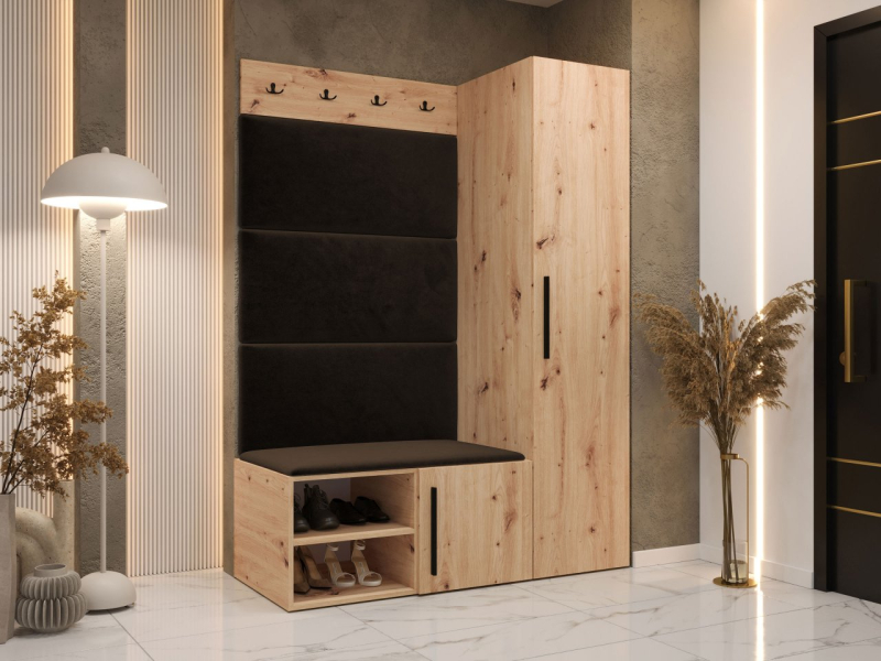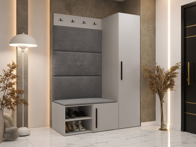 Chodba je důležitou místností v každém domě nebo bytě. Proto se vyplatí doplnit ji funkčním doplňkem, jako je předsíň Hekurt II. Jedná se o chytrou kombinaci několika prvků. Sada obsahuje prostornou skříň s policí a věšákem. Součástí balení je také botník, věšák na kabáty a stylové čalouněné panely.
