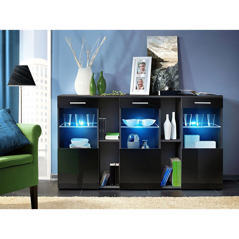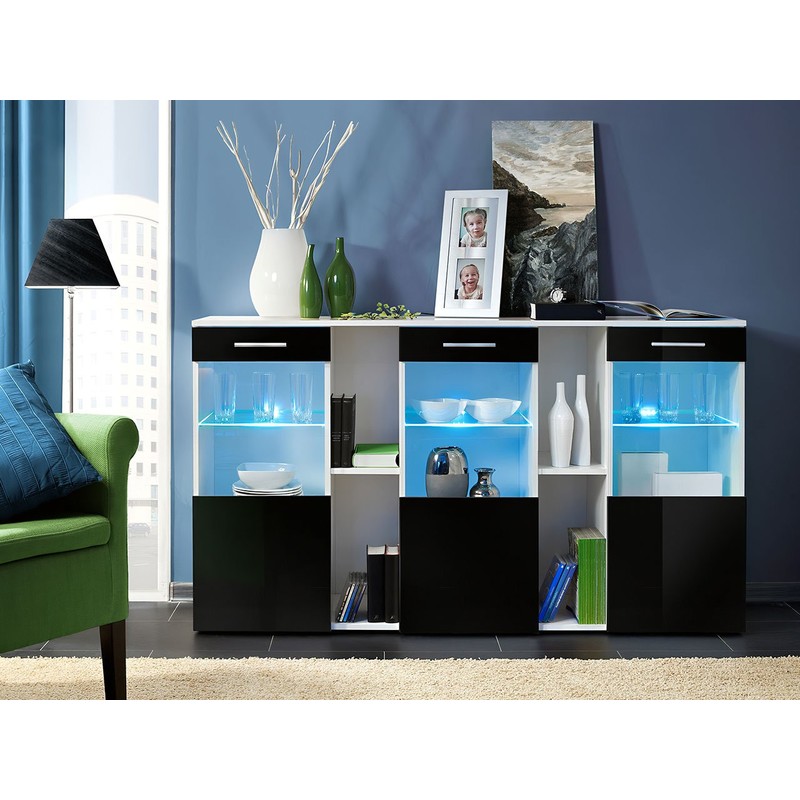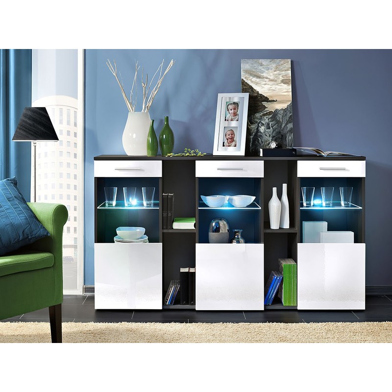 Komoda Niagara je módní kus nábytku ve vašem obývacím pokoji. Promyšlený design zajišťuje optimální množství úložného prostoru a vystavení dekorací. Široký výběr barev frontů a korpusu usnadňuje vytvoření dokonalého uspořádání. Módní barvy komody doplňují prosklené police s LED osvětlením, díky čemuž celek vytváří výrazný efekt, a prostor se zdá být příjemný a větší než ve skutečnosti.