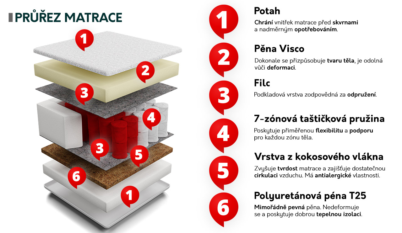 Druhá strana matrace je o něco tvrdší, protože byla vybavena tradiční pěnou. Zatímco srdcem matrace jsou kapesní pružiny - 7 zónové. Jejich úkolem je udržovat páteř na správném místě.
