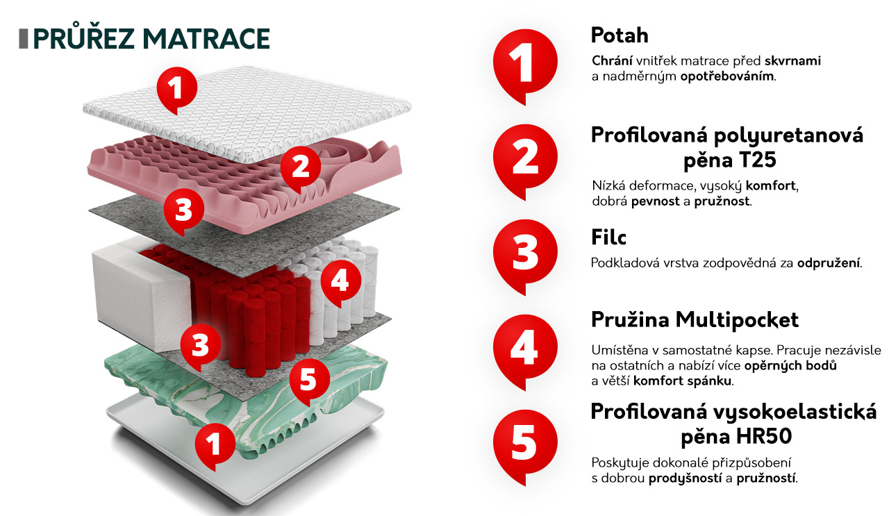 Kombinace různých druhů pěny - polyuretanu s vysoce elastickými pružinami a taštičkovými pružinami poskytuje tělu přiměřenou oporu, dokonale přizpůsobenou svému tvaru a hmotnosti.