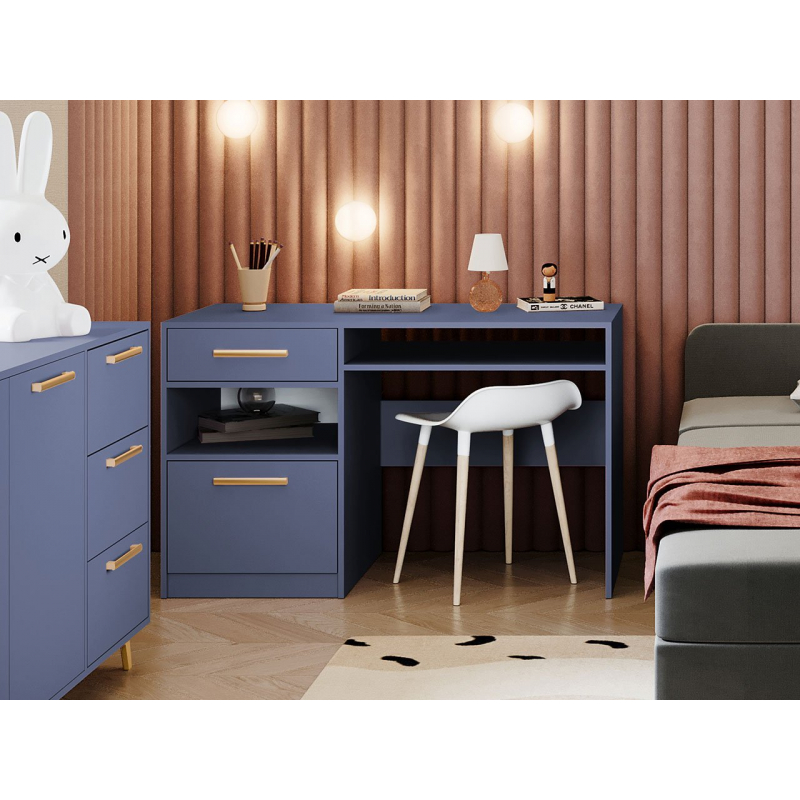 Psací stůl Lily II je perfektní volbou do pokojů pro teenagery a do domácí kanceláře. Prezentovaný model je dostupný v elegantních barvách, které dodají místnosti charakter a styl. Celek doplňují úchyty zlaté barvy.