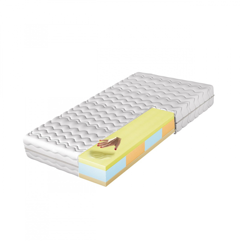 - pěna se 7 zónami T25 o tloušťce 10 cm, na jedné straně pokrytá termoelastickou pěnou (visco) o tloušťce 3 cm a na druhé straně vysoce pružnou pěnou o tloušťce 3 cm,