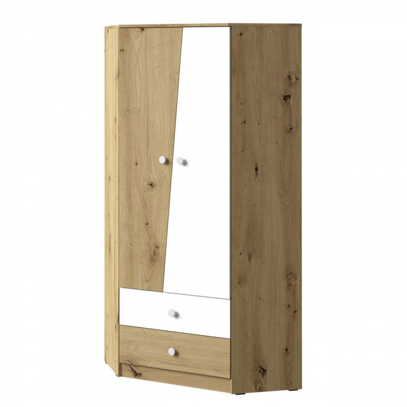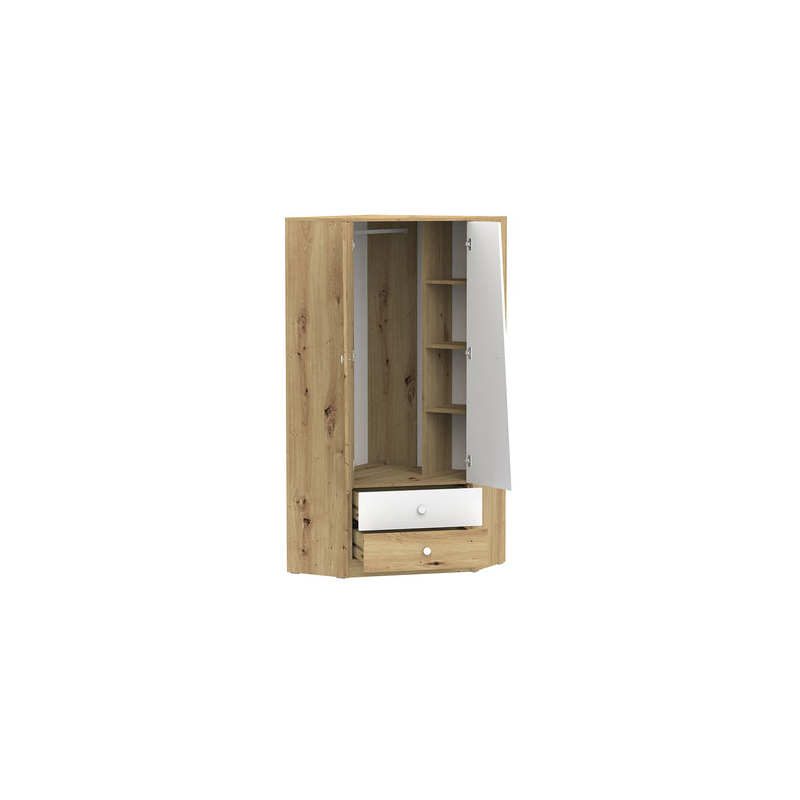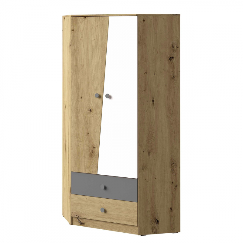 Prostorný interiér rohové šatní skříně Wurak se zásuvkami poskytuje dostatek úložného prostoru. Vestavěné police v kombinaci s prostorem pro zavěšení oblečení na ramínka poskytují optimální podmínky pro šatník teenagera. Z vnější strany má šatní skříň také snadno přístupné zásuvky, do kterých může mladý student uložit často používané doplňky.