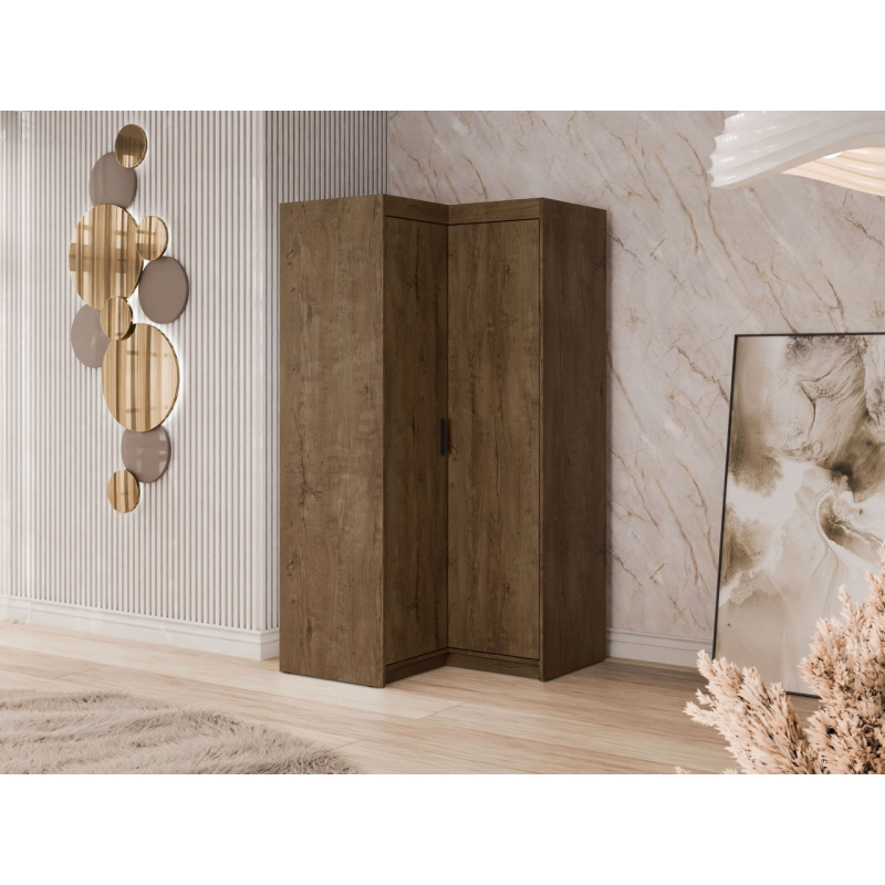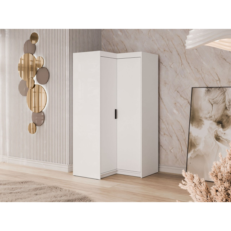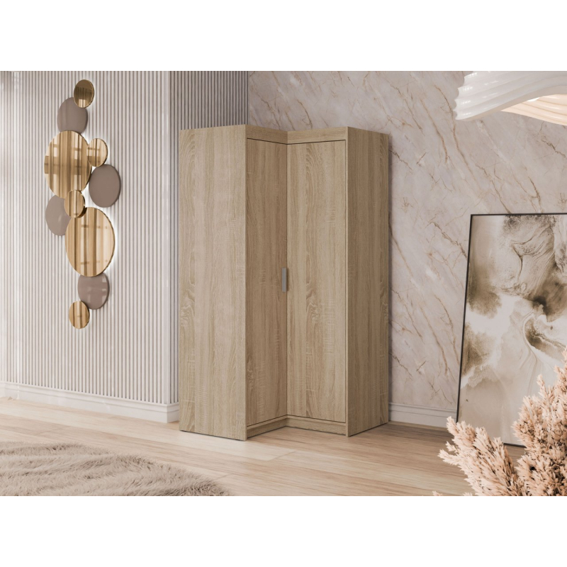 Rohový design šatní skříně Melen 2D umožňuje efektivní využití dostupného prostoru. Interiér nabízí tyč, na kterou si můžete pohodlně zavěsit oblečení i prostorné police, které umožňují pohodlné uložení oblečení, obuvi a jiných drobností.