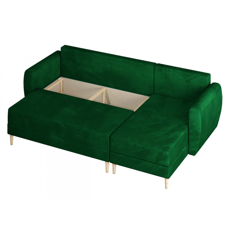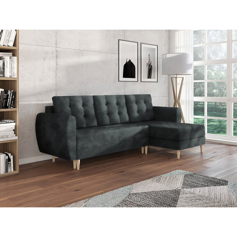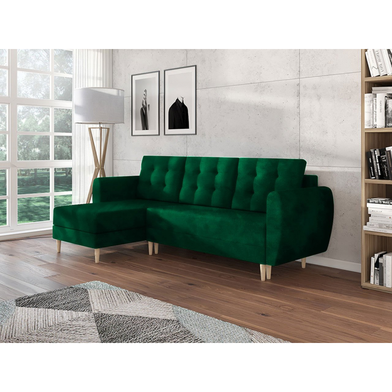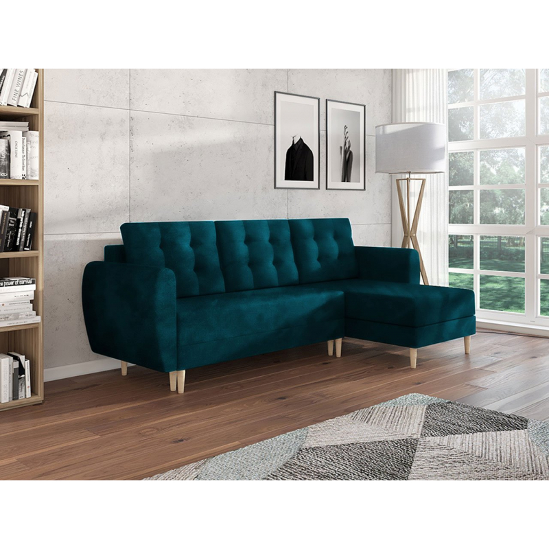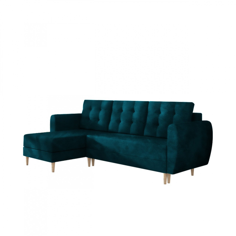 Rohová sedačka Eska 9 bude určitě vyhovovat skandinávským a elegantnějším obývacím pokojům. Rohová sedačka je založena na dřevěných tvarovaných nohou, které jsou vyrobeny z borovice. Dekorativní částí nábytku jsou jemně zaoblené područky a opěradlo s hlubokým prošíváním. Rohová sedačka Eska mě klasickou podobu podobnou písmenu "L". Další výhodou sedačky je funkce na spaní s plochou 140 cm x 200 cm. V rohové části se nachází úložný prostor.
