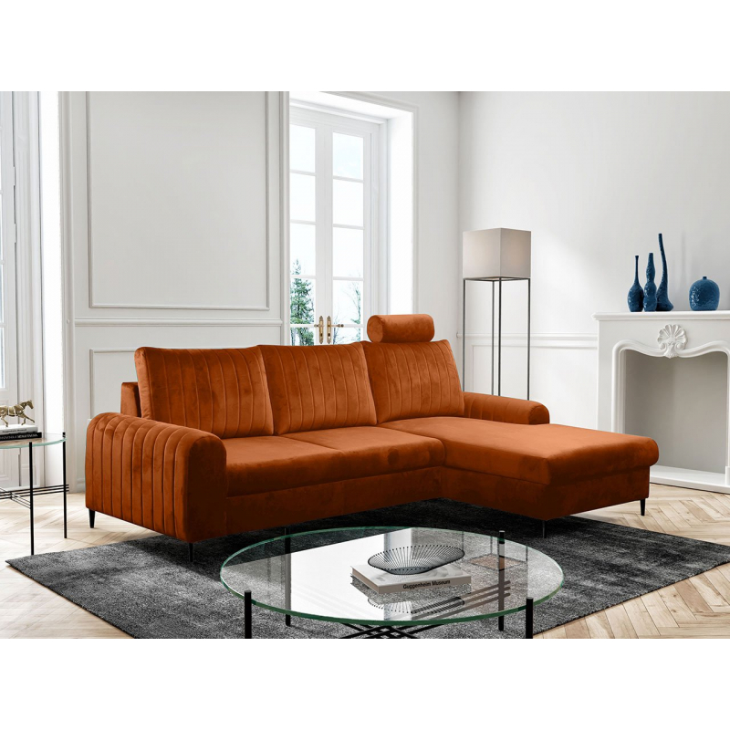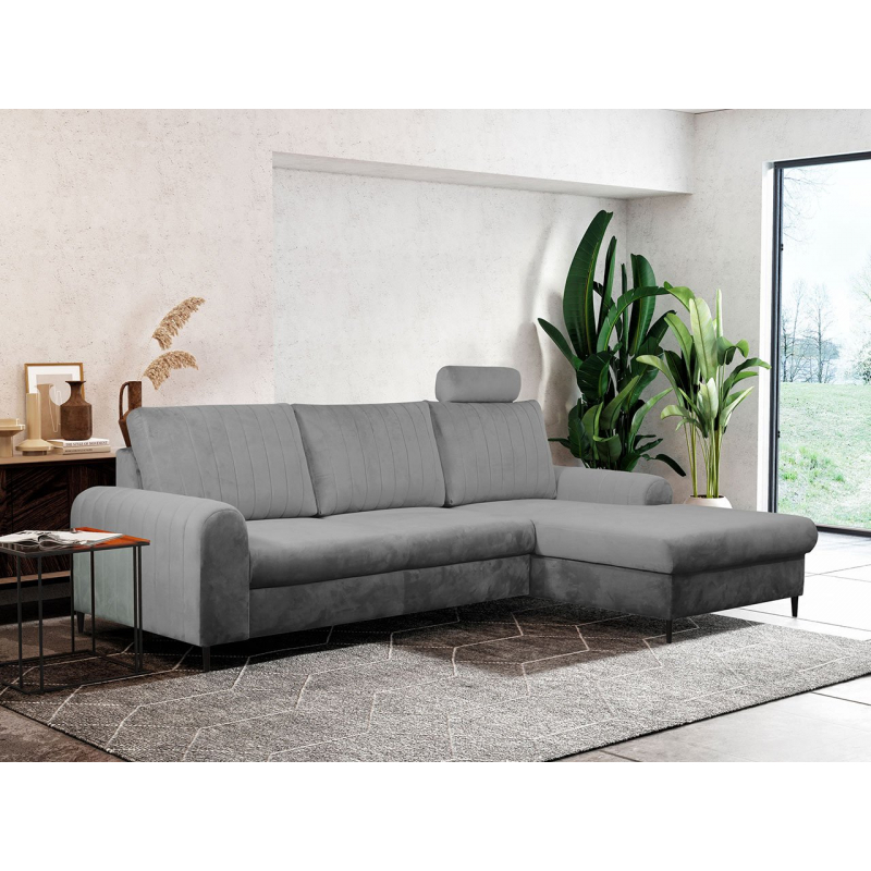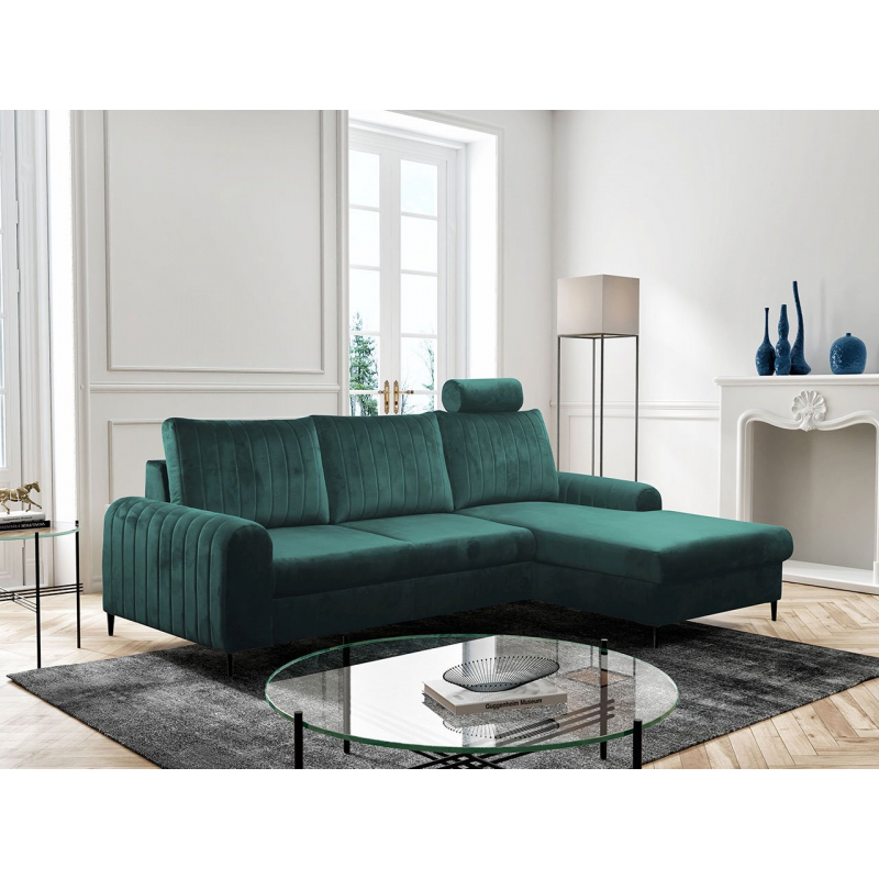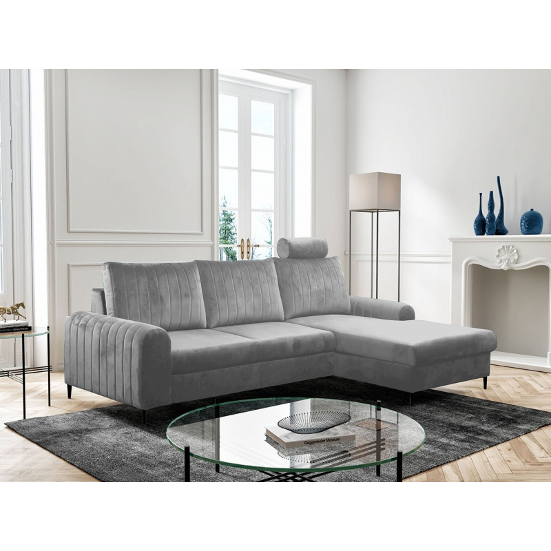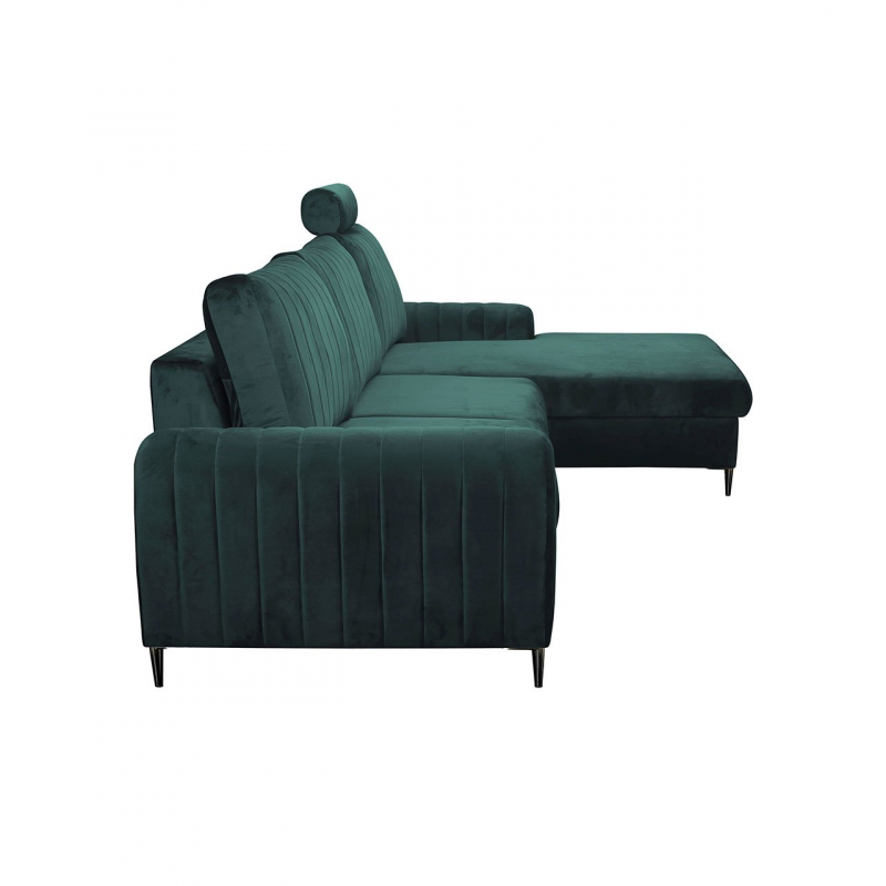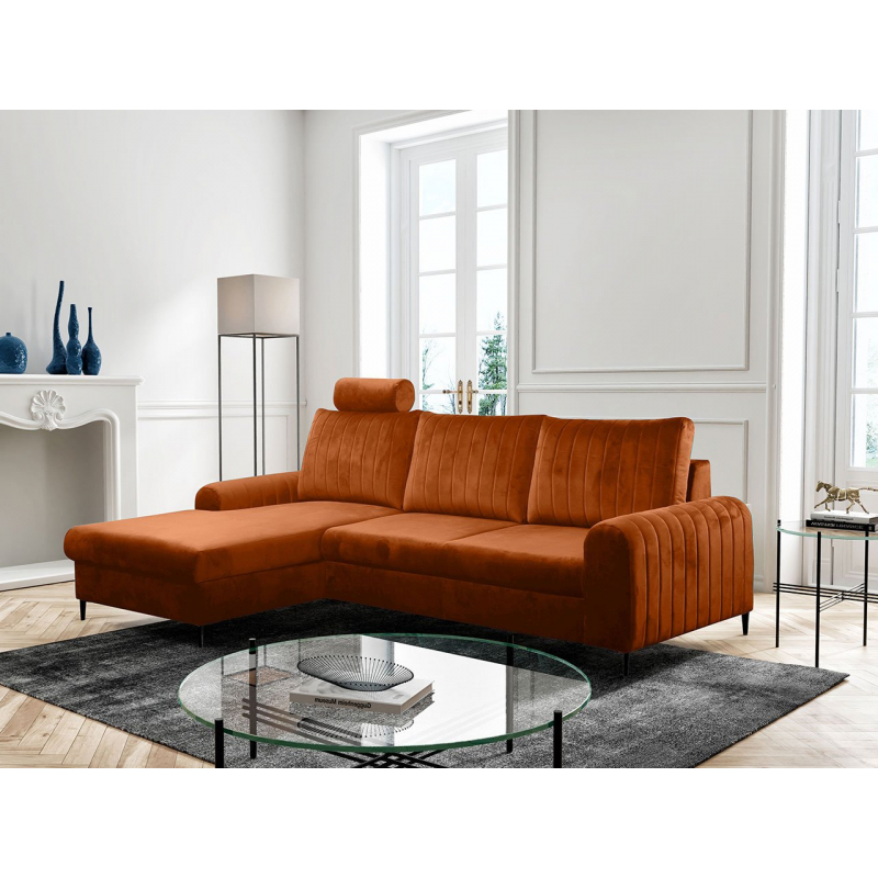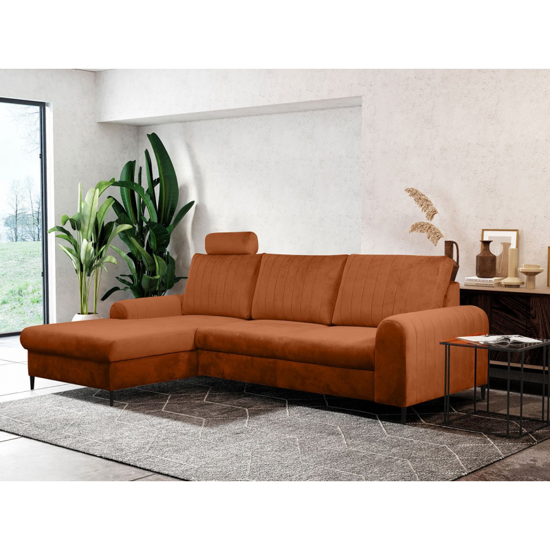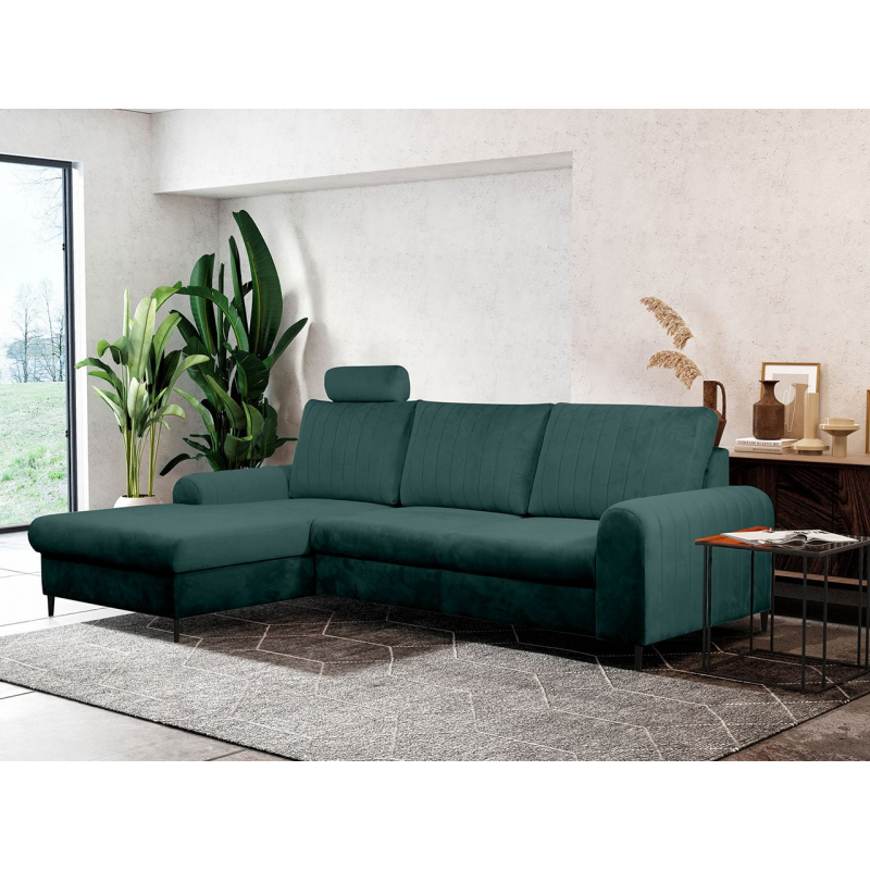 Moderní rohová rozkládací pohovka Olazilla je vyrobena z vysoce kvalitních komponentů, které zajišťují pohodlí během používání. Jemné prošívání podél nastavitelných polštářů v opěradle a na vnějších stranách područek jí dodává estetický vzhled. Vysoké černé kovové nohy jí dodávají stylový nádech.