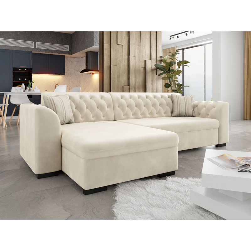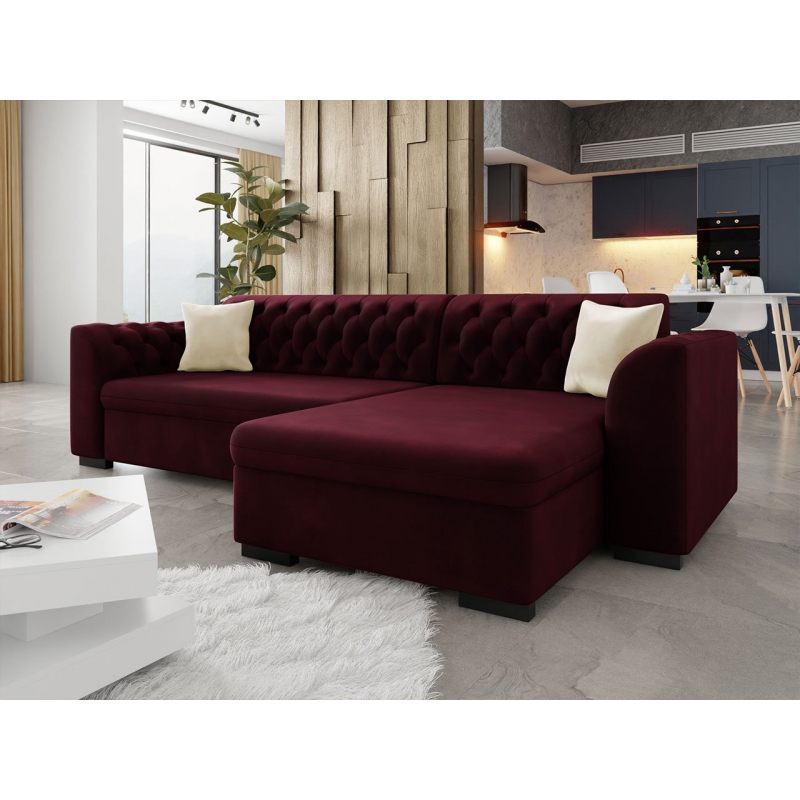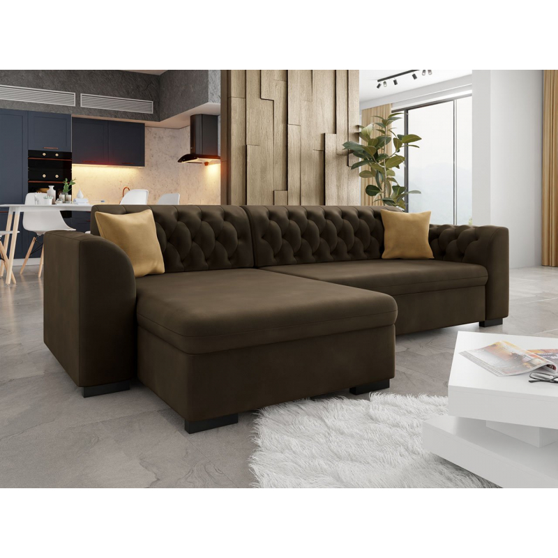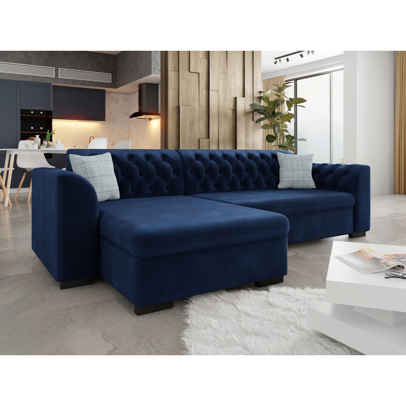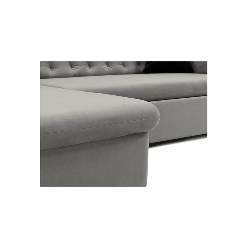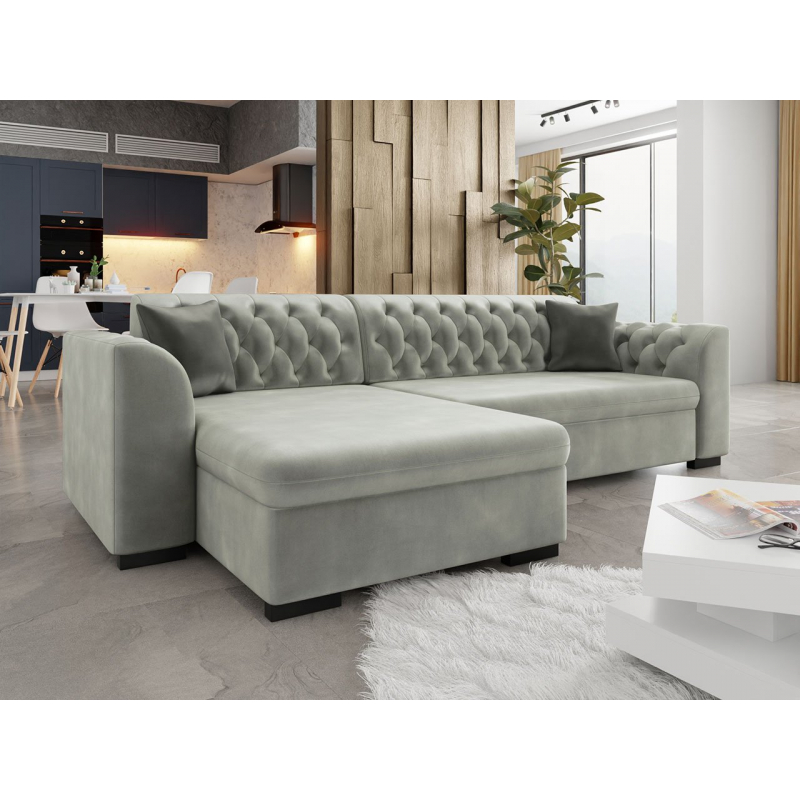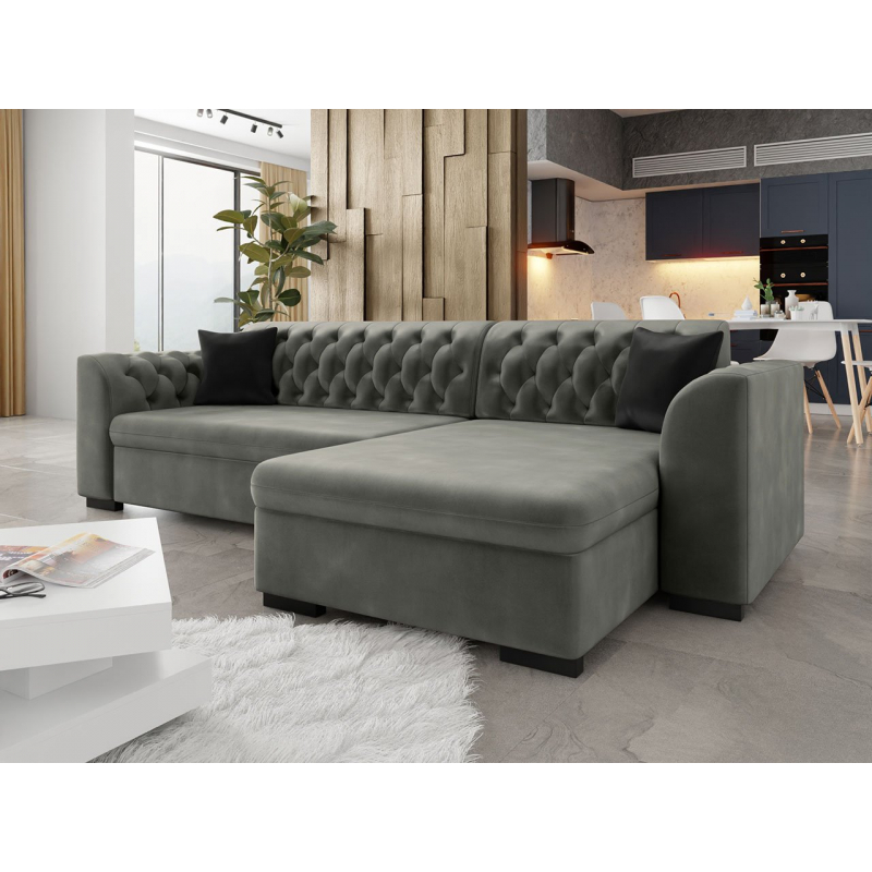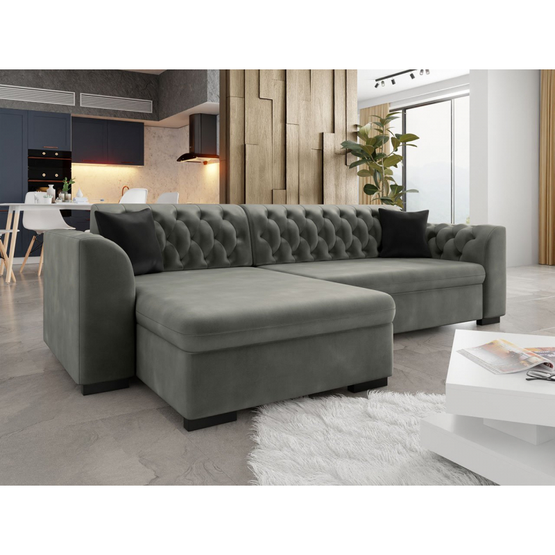 Rohová rozkládací pohovka Akimbo je elegantní nabídka! Charakter podtrhuje hluboké prošívání, které bylo použito na zádové opěrce a vnitřní části područek. Dekorativní akcent navíc dokonale ladí s použitou látkou. Navíc sada obsahuje dva malé polštářky se zipem.