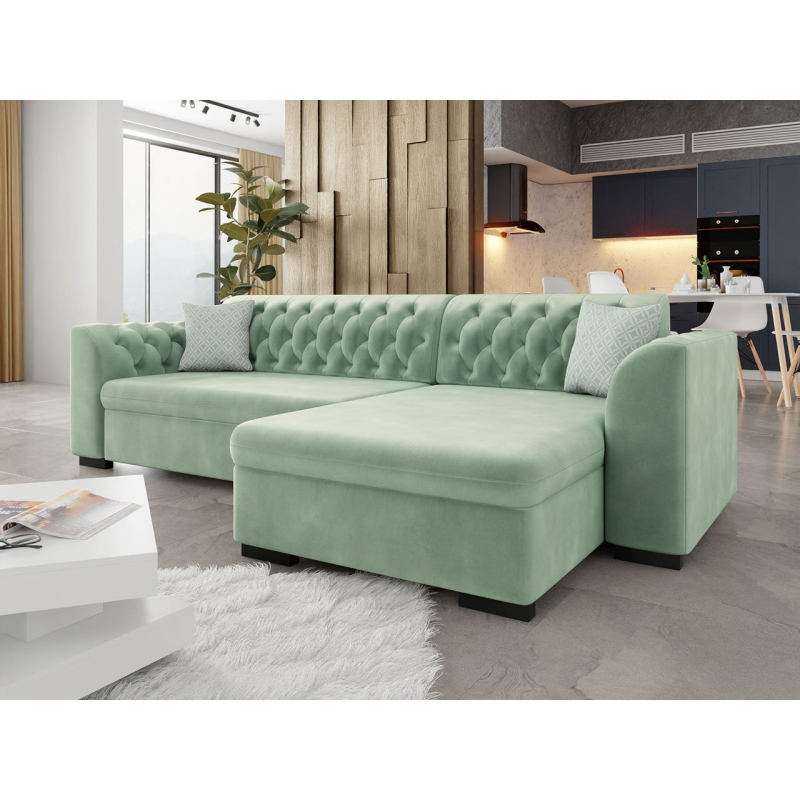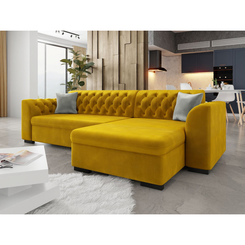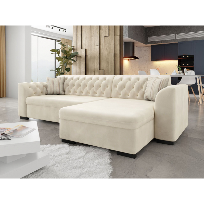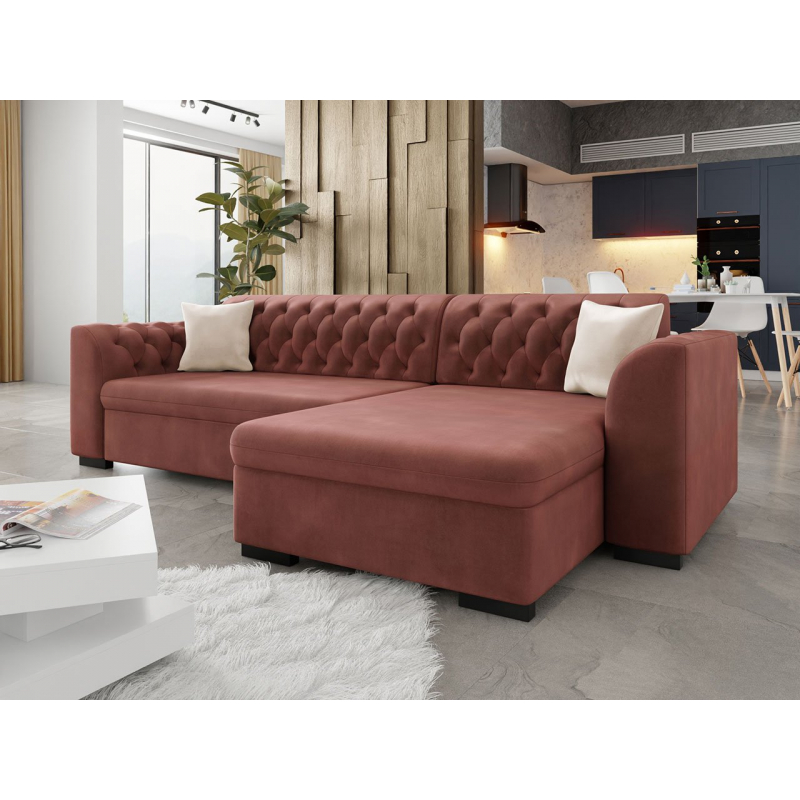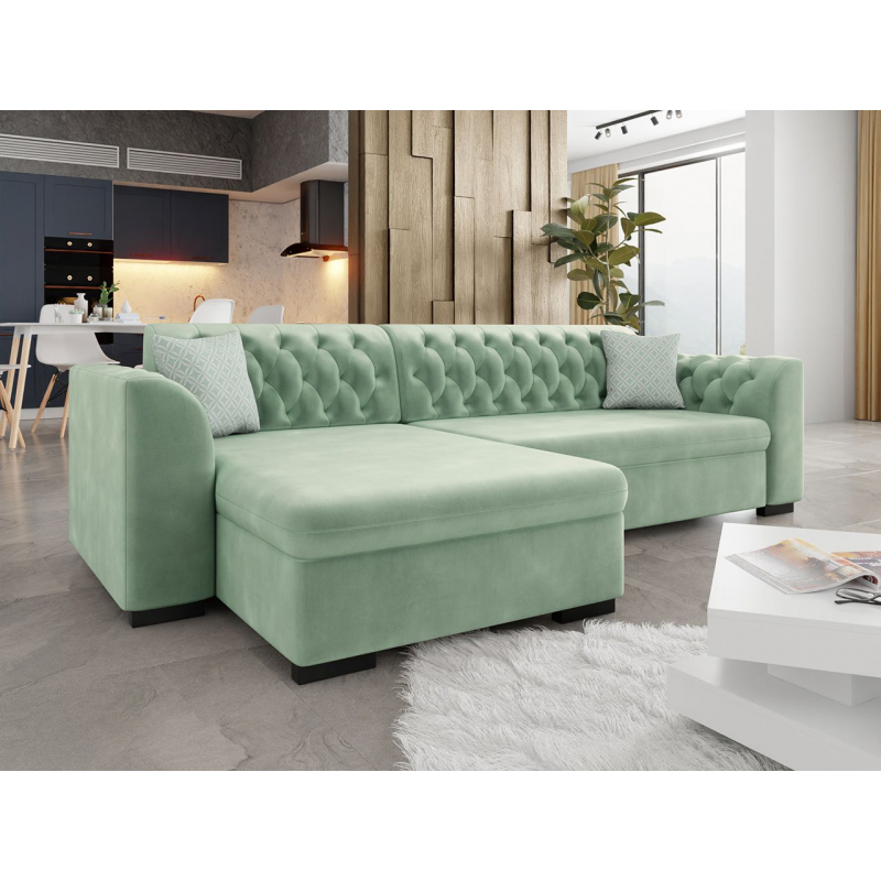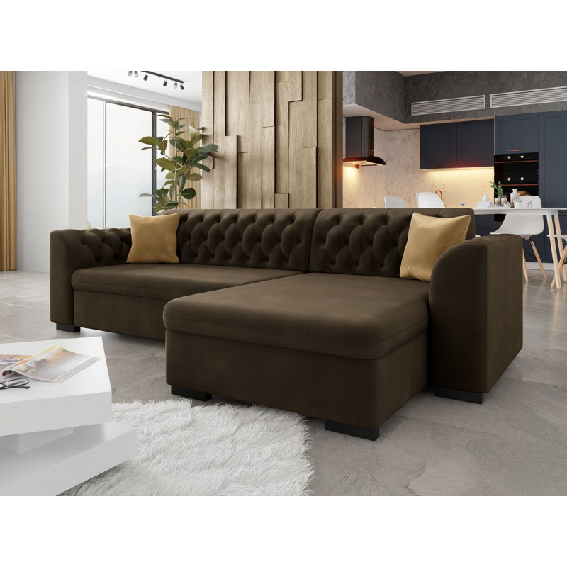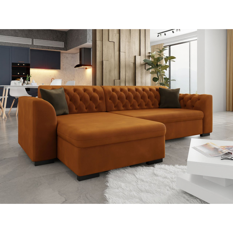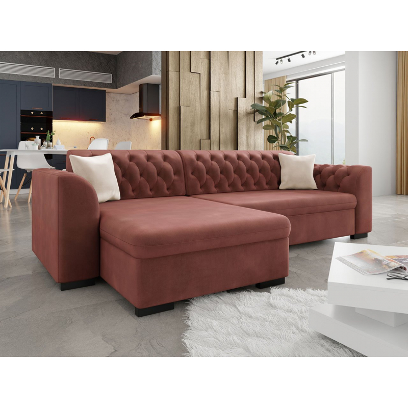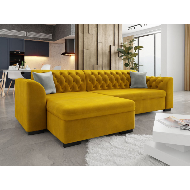 Rohová rozkládací pohovka Akimbo je elegantní nabídka! Charakter podtrhuje hluboké prošívání, které bylo použito na zádové opěrce a vnitřní části područek. Dekorativní akcent navíc dokonale ladí s použitou látkou. Navíc sada obsahuje dva malé polštářky se zipem.