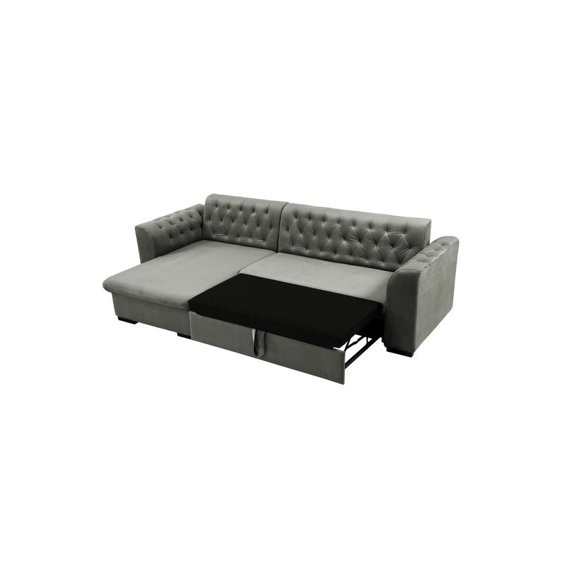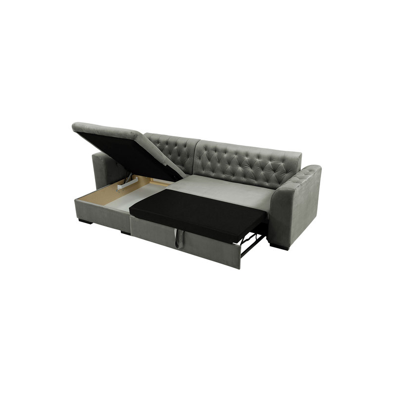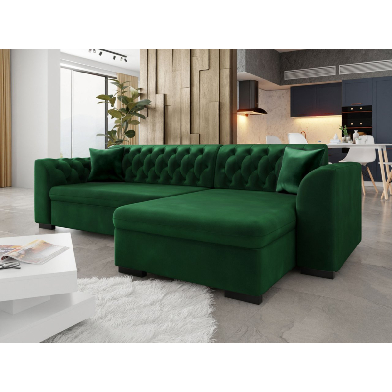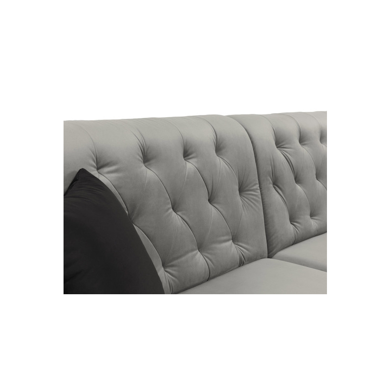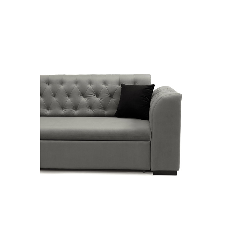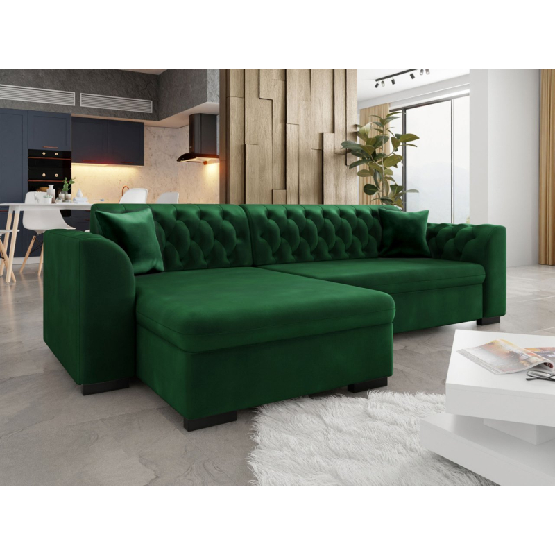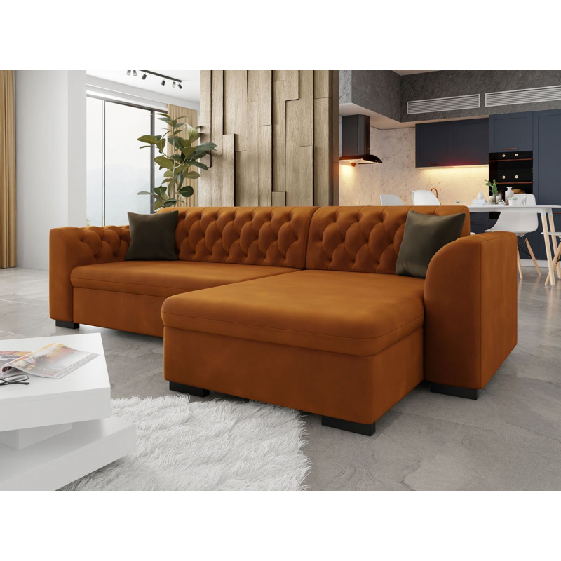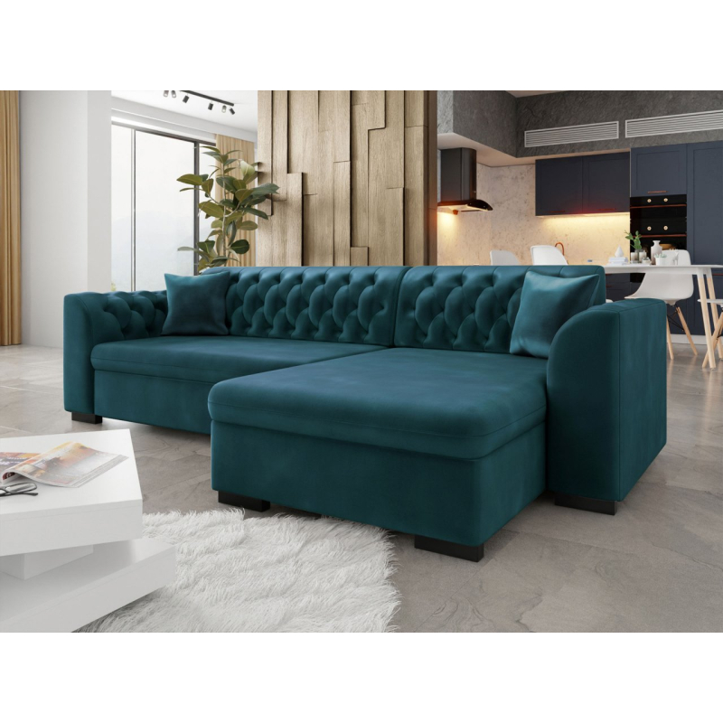 Rohová rozkládací pohovka Akimbo je elegantní nabídka! Charakter podtrhuje hluboké prošívání, které bylo použito na zádové opěrce a vnitřní části područek. Dekorativní akcent navíc dokonale ladí s použitou látkou. Navíc sada obsahuje dva malé polštářky se zipem.