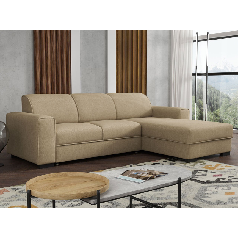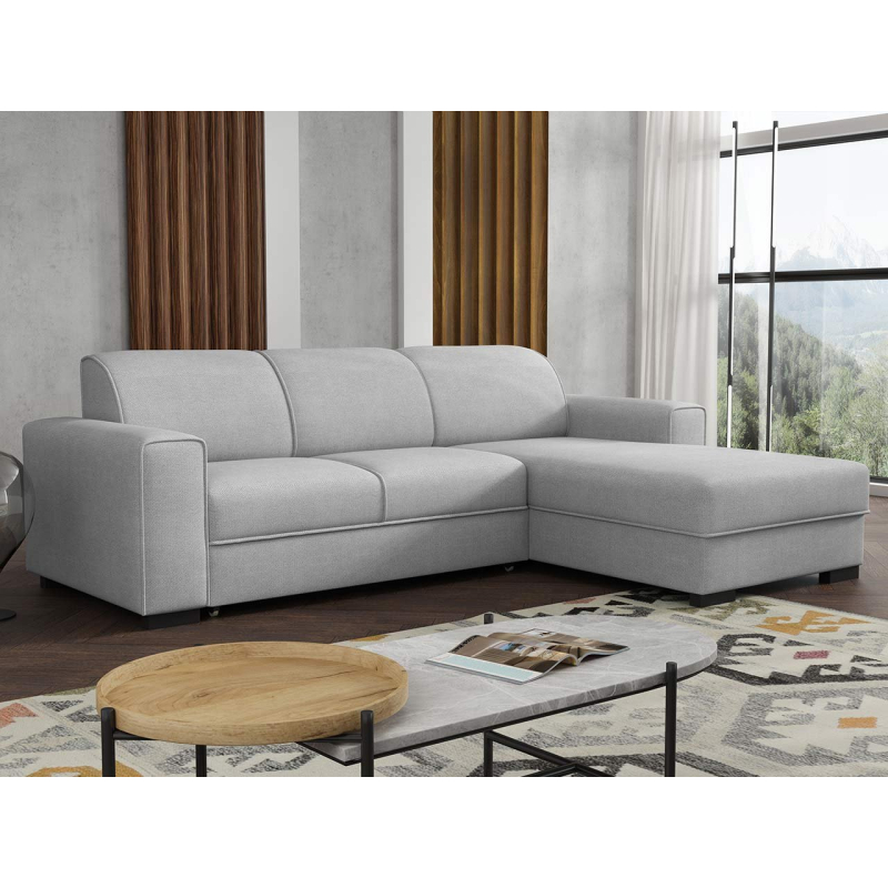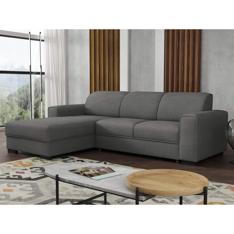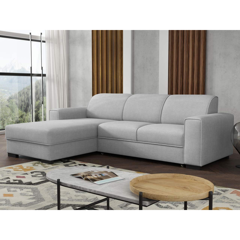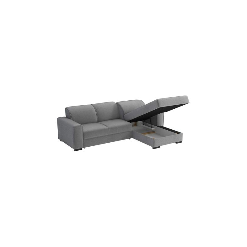Moderní rohová rozkládací sedací souprava má také prostornou plochu na spaní. V rozloženém stavu poskytuje pohodlné podmínky pro každodenní spaní. Hodí se také jako náhradní prostor pro příležitostné hosty na přespání. V otomanu se ukrývá také úložný prostor. Tento prostorný úložný prostor umožňuje diskrétně uložit polštáře, peřiny nebo náhradní přikrývky pro chladnější večery.