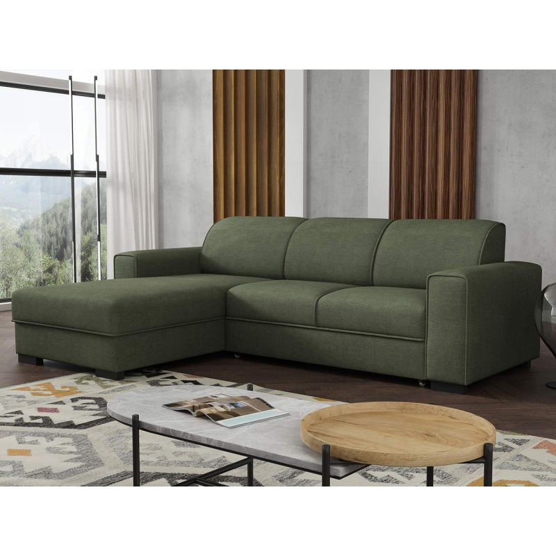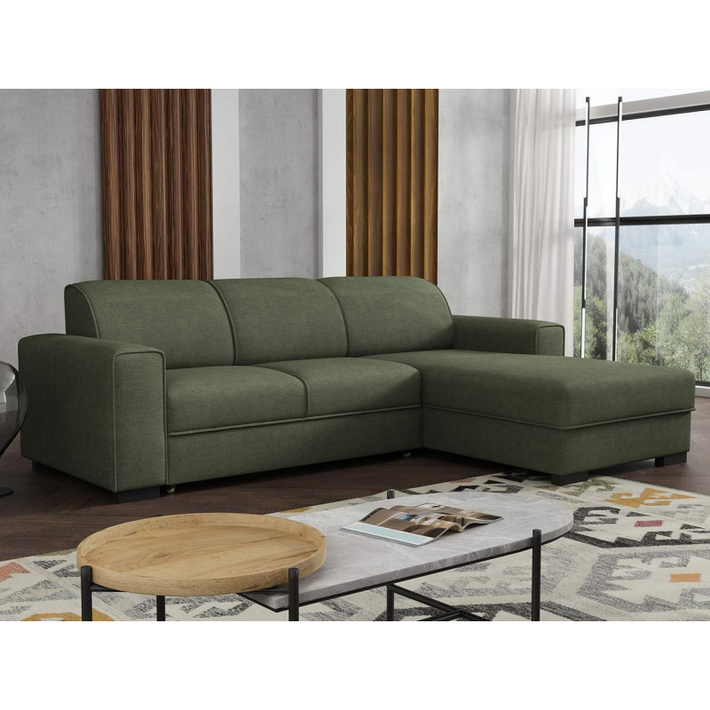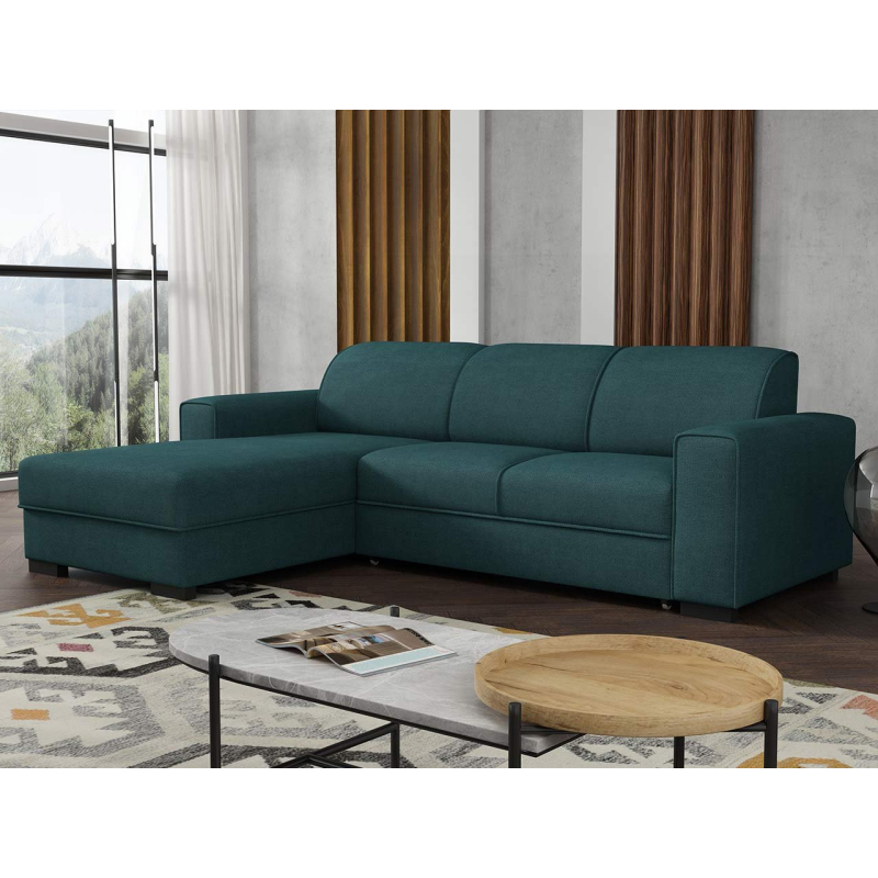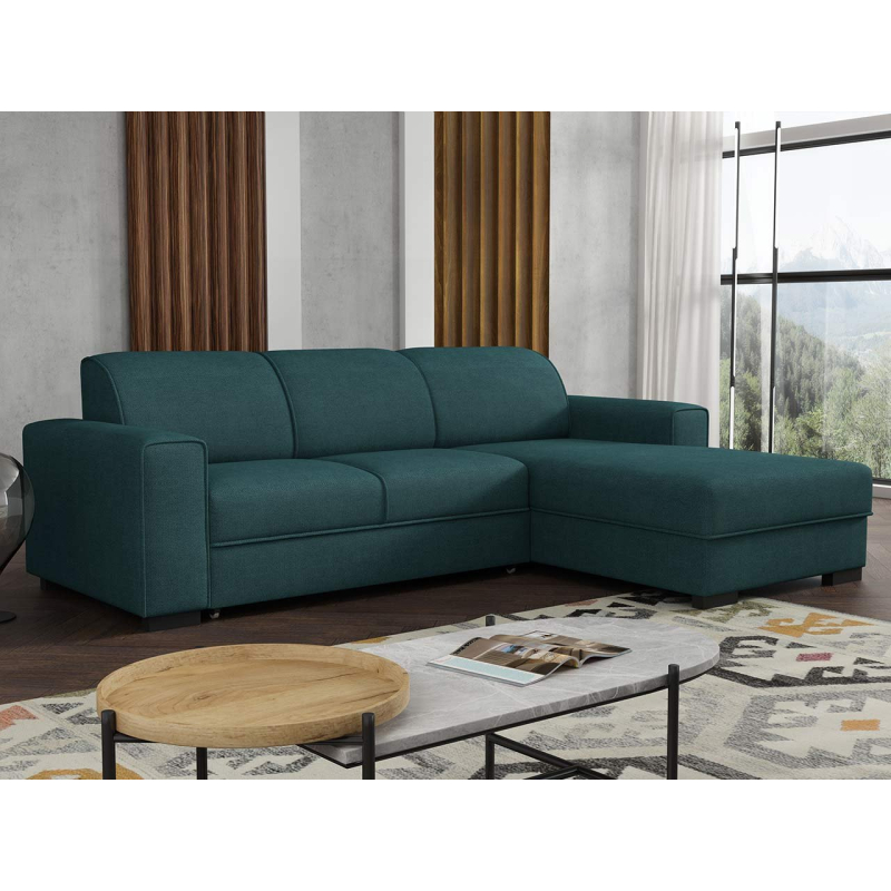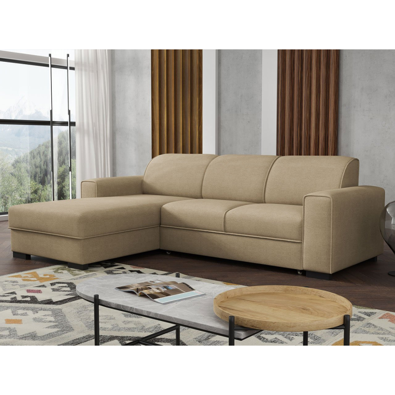 Moderní rohová rozkládací sedací souprava má také prostornou plochu na spaní. V rozloženém stavu poskytuje pohodlné podmínky pro každodenní spaní. Hodí se také jako náhradní prostor pro příležitostné hosty na přespání. V otomanu se ukrývá také úložný prostor. Tento prostorný úložný prostor umožňuje diskrétně uložit polštáře, peřiny nebo náhradní přikrývky pro chladnější večery.