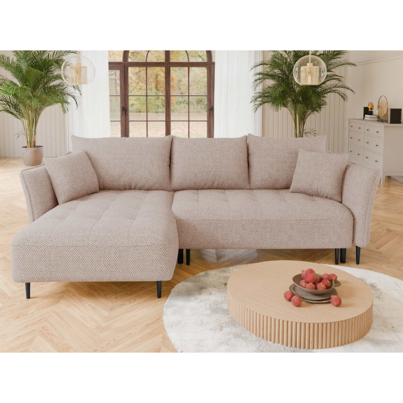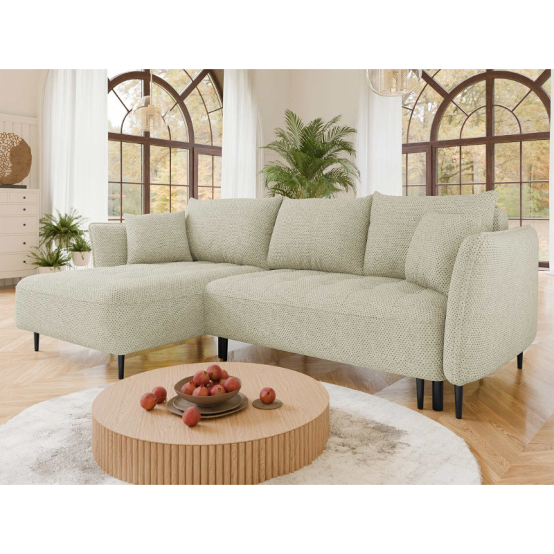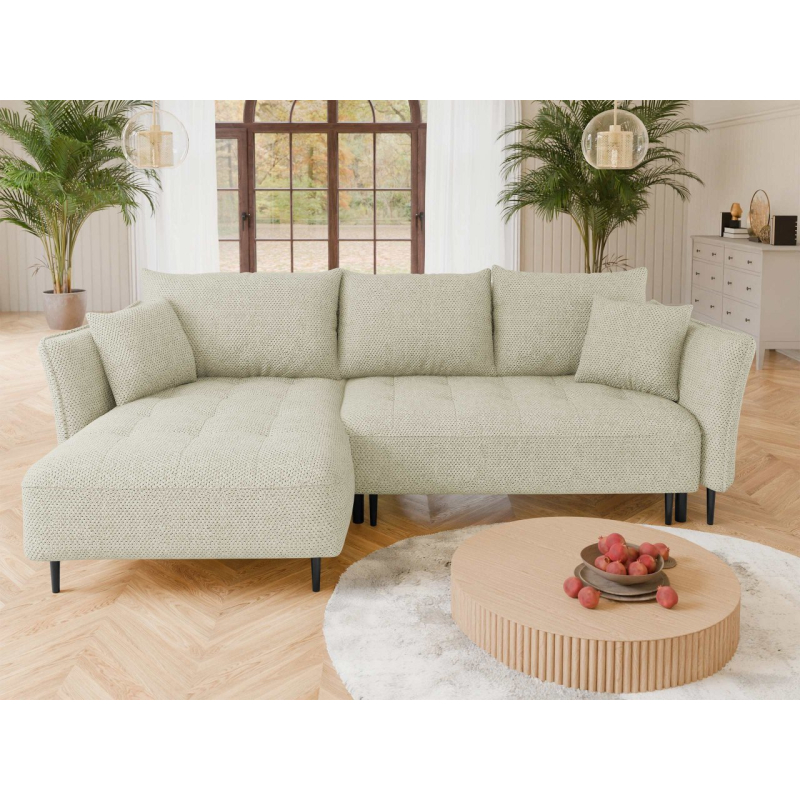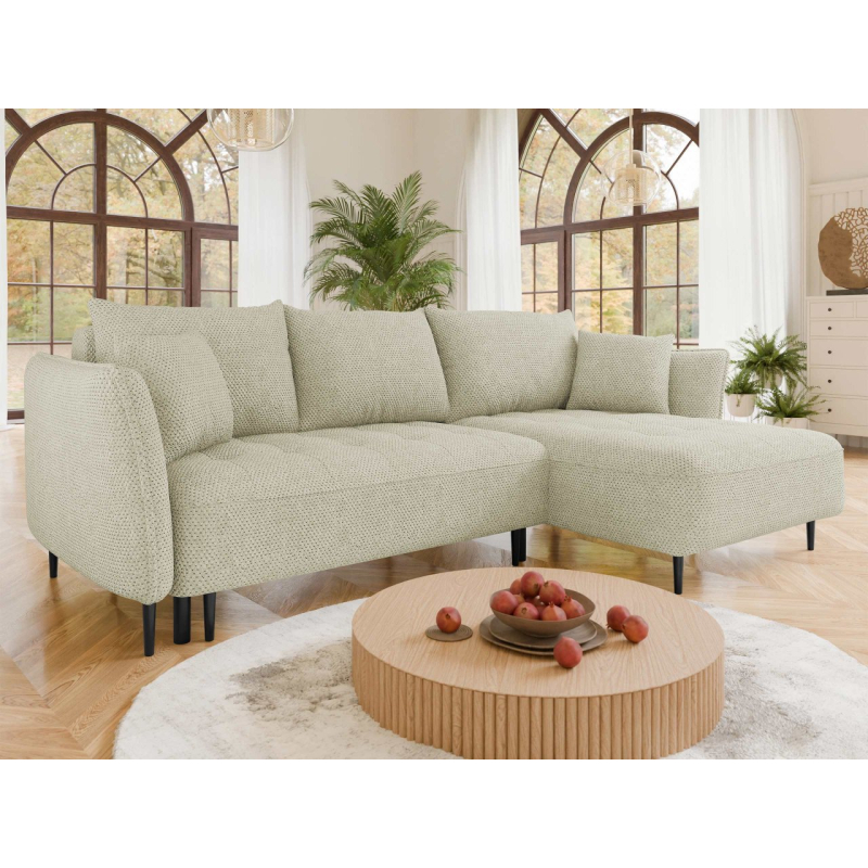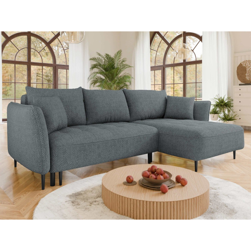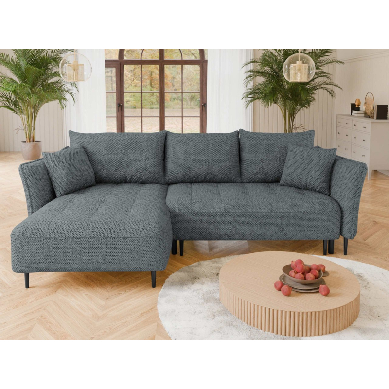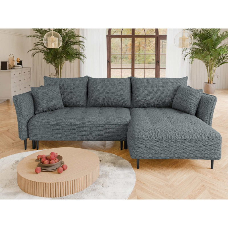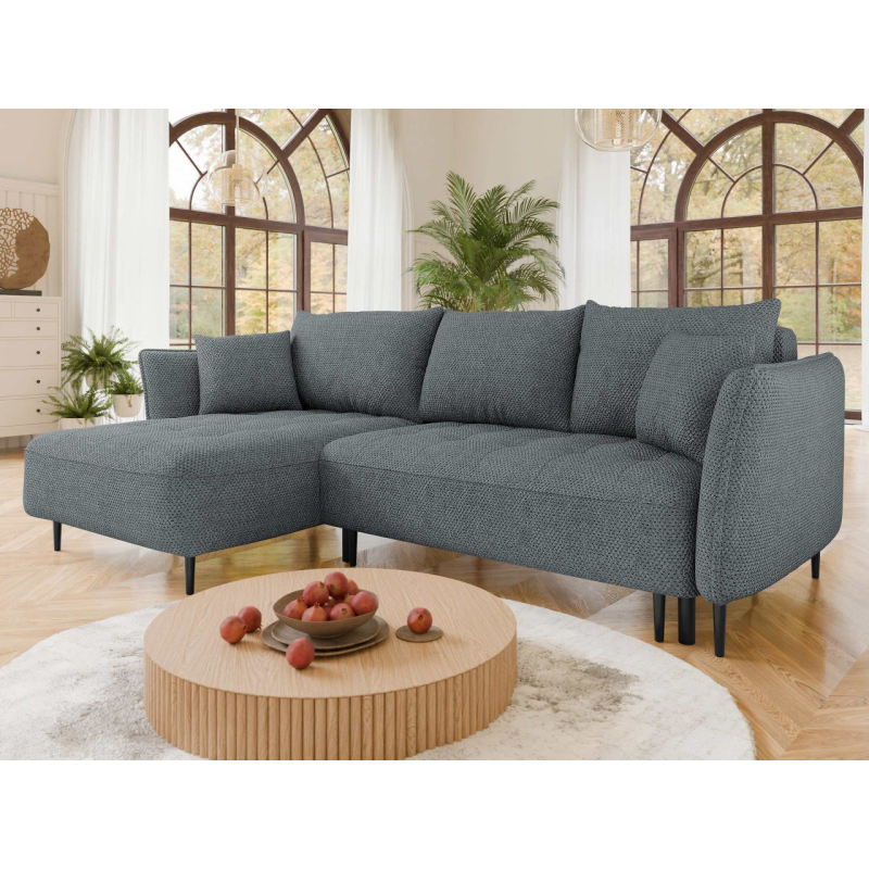 Rohová sedačka s funkcí spaní je potažena příjemnou potahovou látkou v tlumené barvě. Dalším zajímavým prvkem nábytku jsou bočnice, které mají mírně nepravidelný tvar. Rohová sedací souprava s úzkými bočnicemi, tedy područkami, dokonale zapadá do současných designových trendů.
