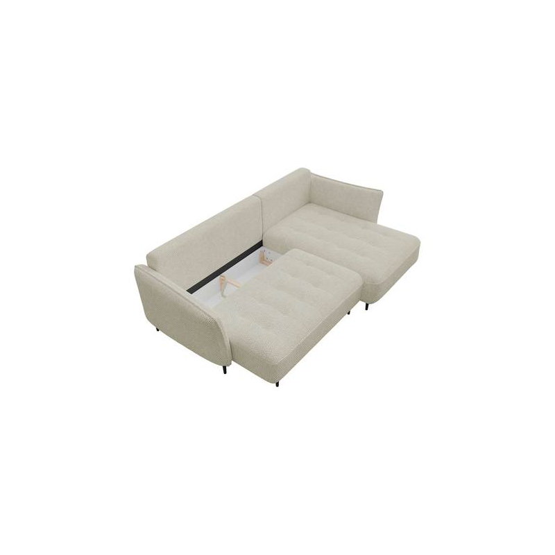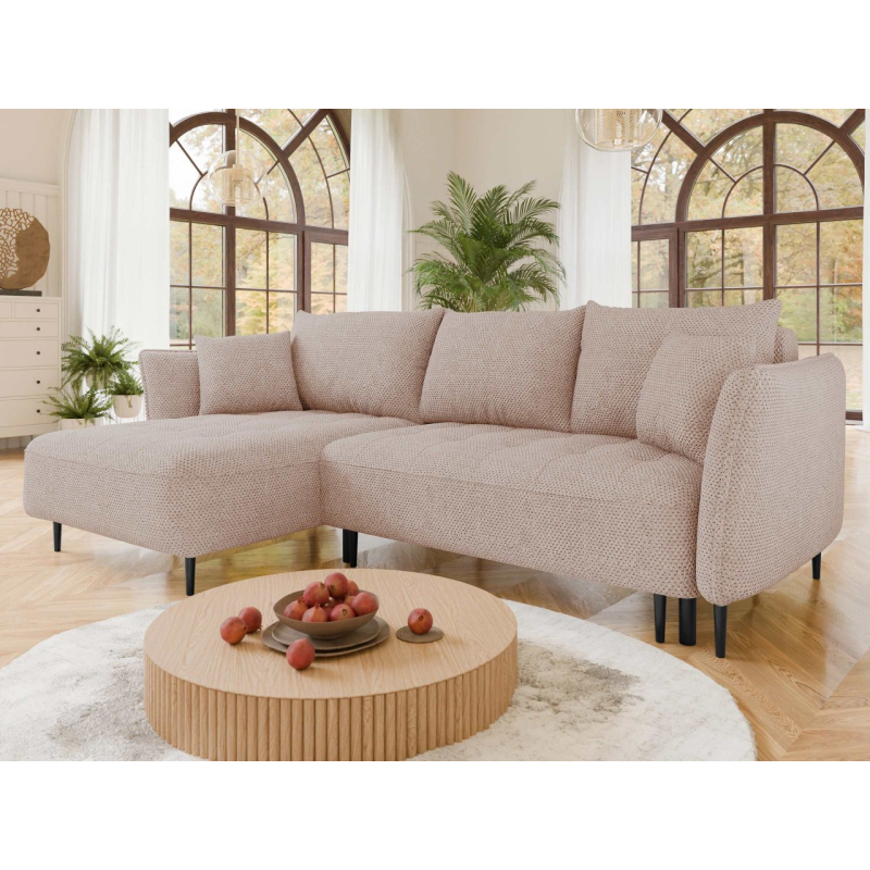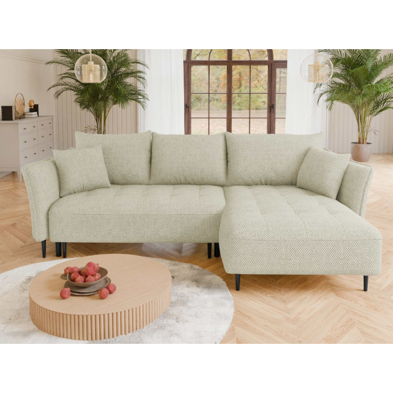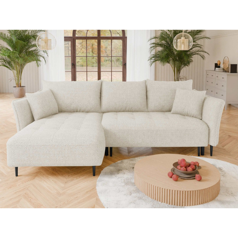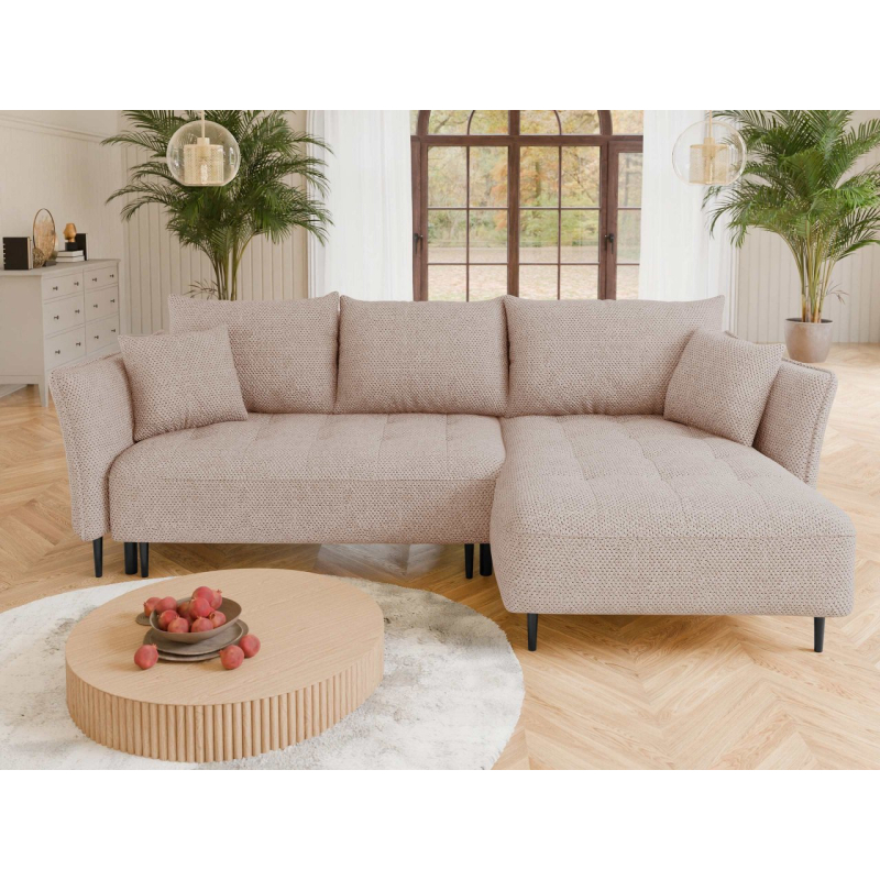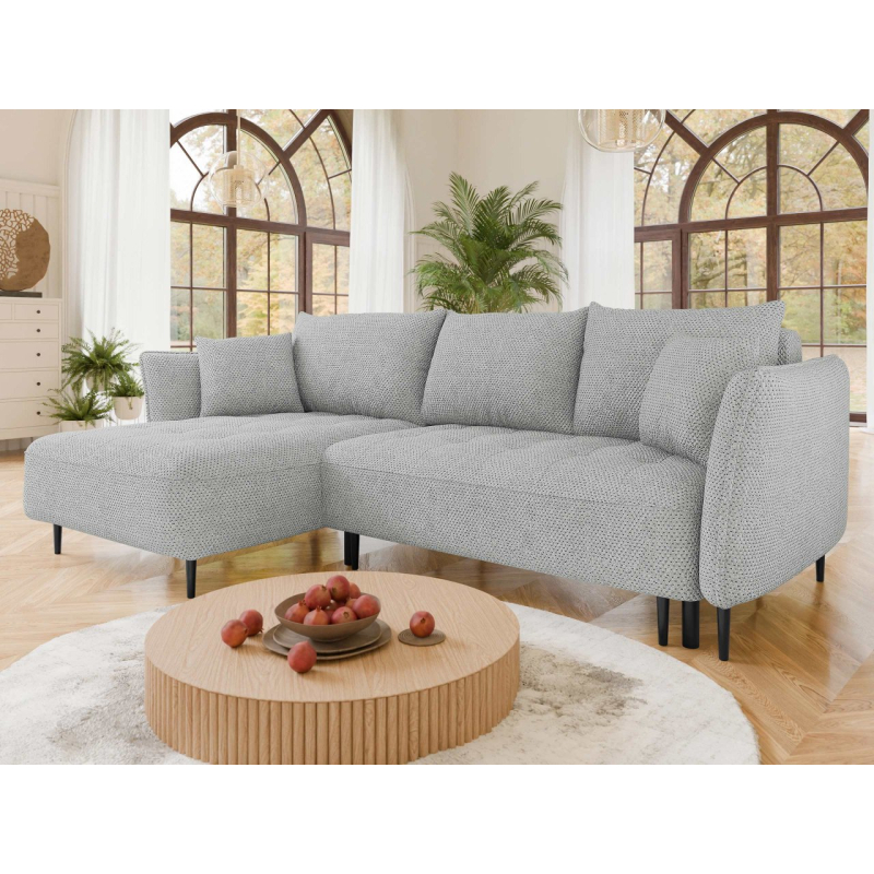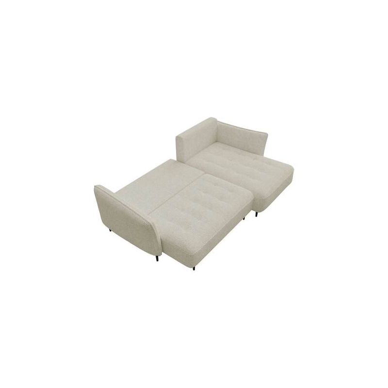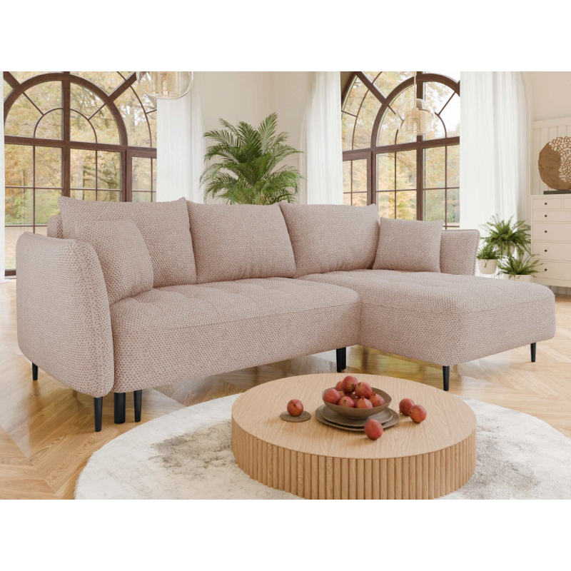 Rohová sedačka s funkcí spaní je potažena příjemnou potahovou látkou v tlumené barvě. Dalším zajímavým prvkem nábytku jsou bočnice, které mají mírně nepravidelný tvar. Rohová sedací souprava s úzkými bočnicemi, tedy područkami, dokonale zapadá do současných designových trendů.