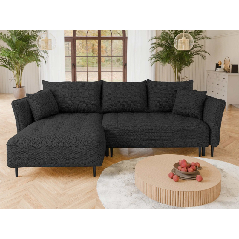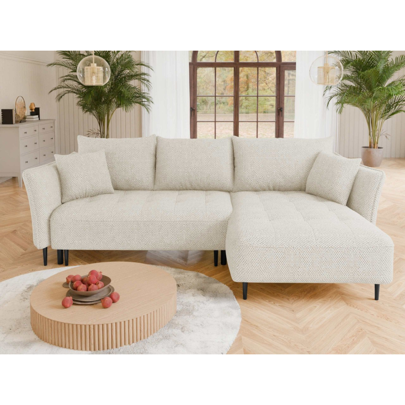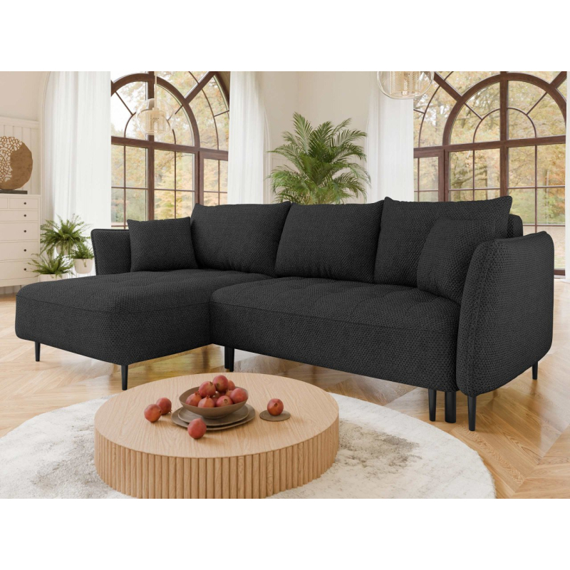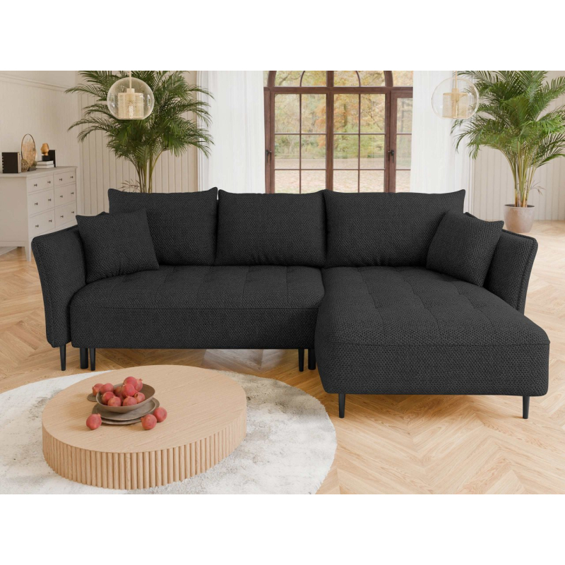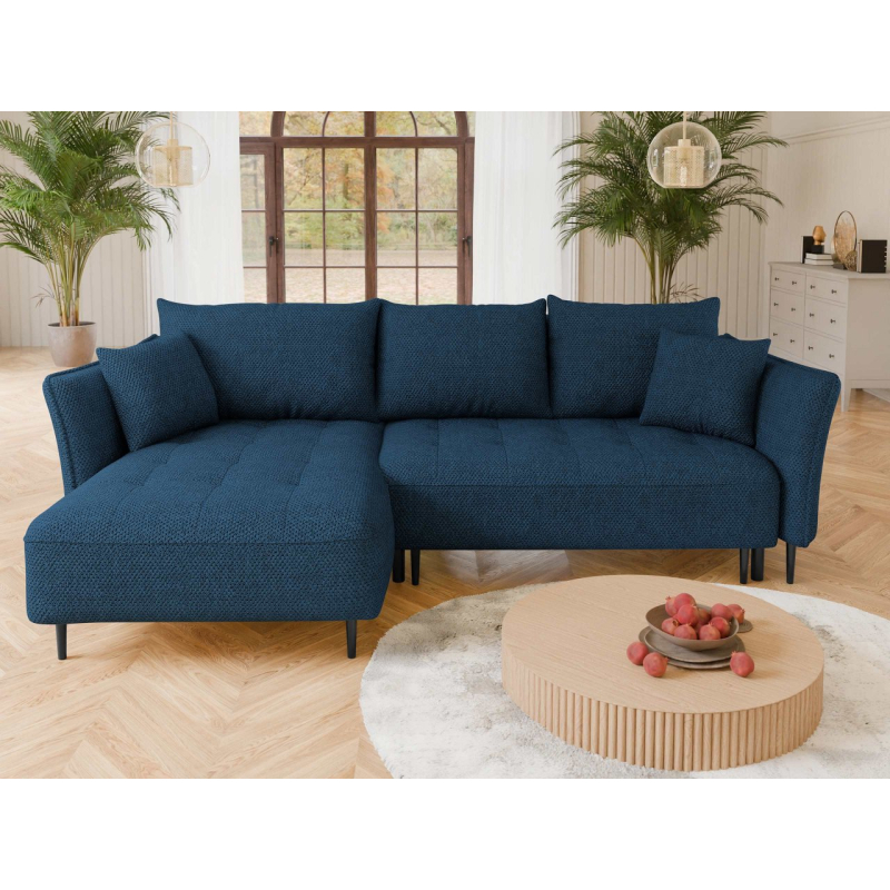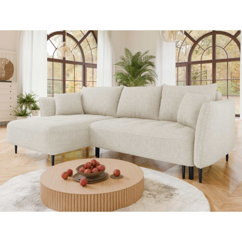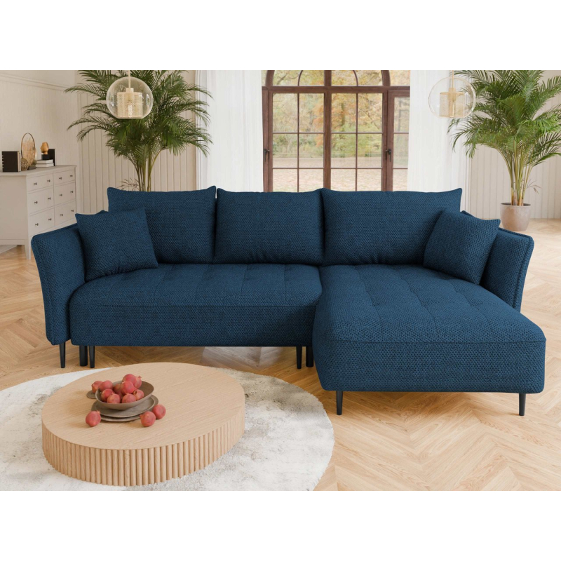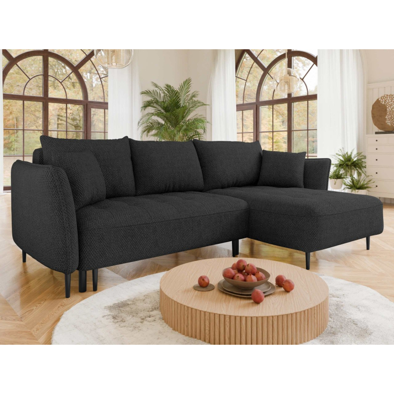 Rohová sedačka s funkcí spaní je potažena příjemnou potahovou látkou v tlumené barvě. Dalším zajímavým prvkem nábytku jsou bočnice, které mají mírně nepravidelný tvar. Rohová sedací souprava s úzkými bočnicemi, tedy područkami, dokonale zapadá do současných designových trendů.