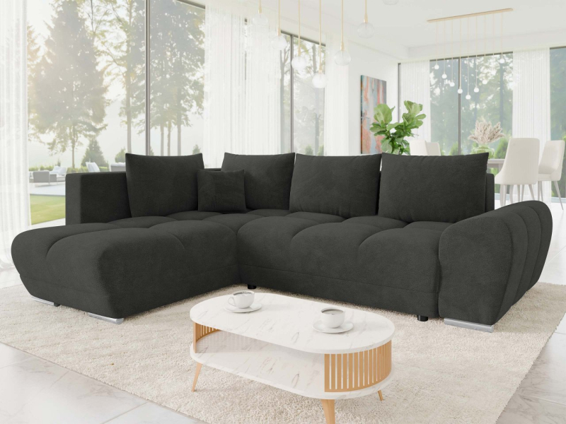 Rohová rozkládací pohovka má ve svém designu také prostorný úložný prostor, ideální pro přikrývky, polštáře a další věci, které nemají své konkrétní místo. Model Brapko je perfektním společníkem pro ranní šálek kávy nebo večerní odpočinek po intenzivním dni.