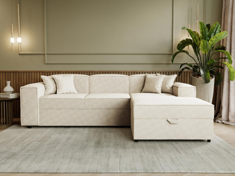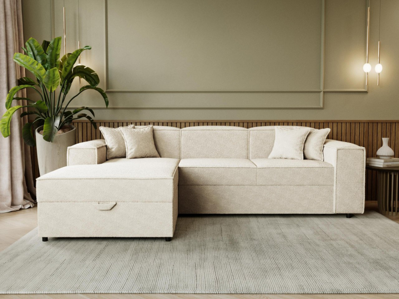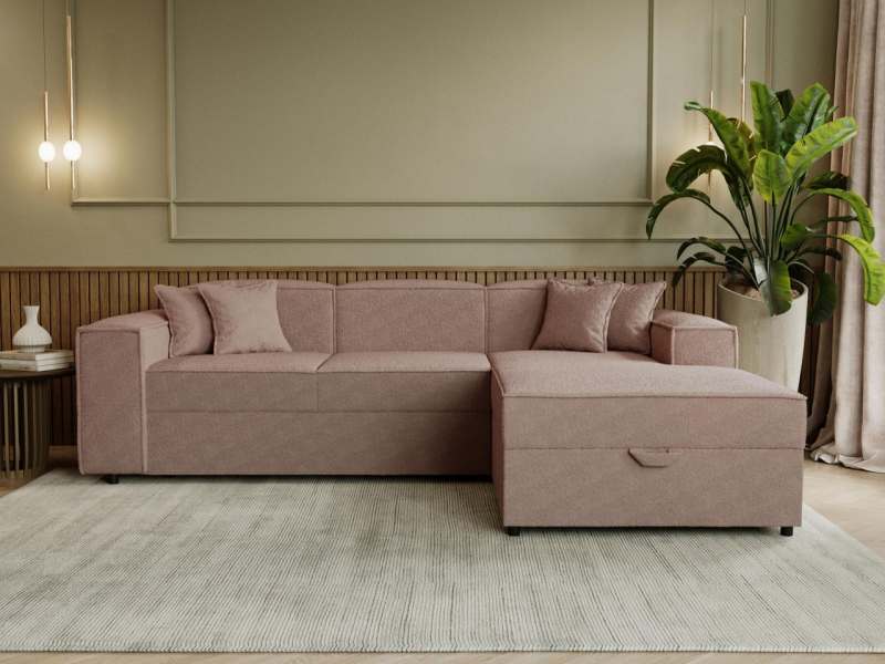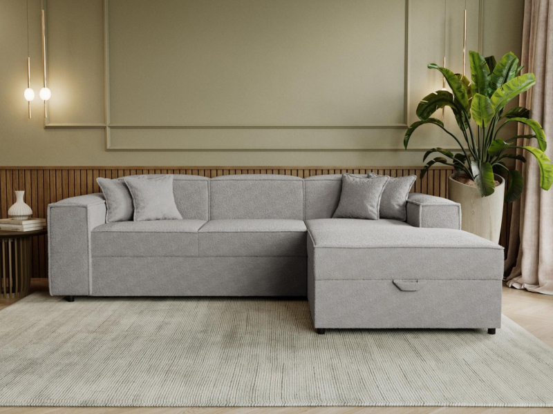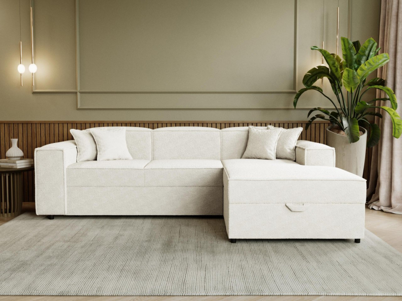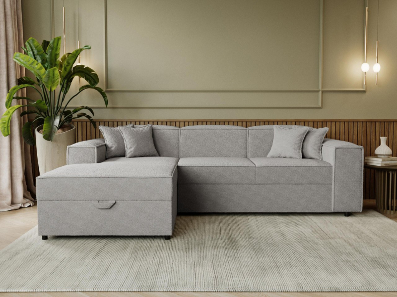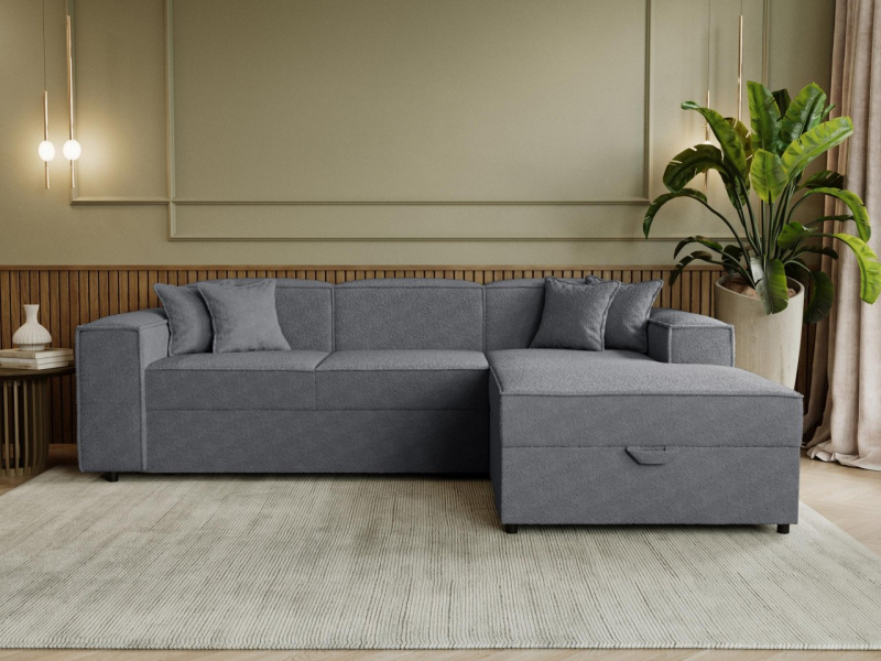 Funkčnost je také výhodou, o čemž svědčí její rozkládací funkce. Pomocí rukojeti zobrazené na fotografiích můžete rychle a snadno připravit místo na spaní. Moderní rohová pohovka Sokoz L Boucle má také přihrádku na ložní prádlo. Diskrétně skrytá zásuvka řeší problém se skladováním polštářů a peřin.
