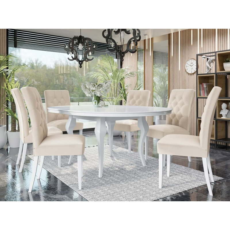 Stůl a židle jsou vyrobeny z vysoce kvalitních komponentů. Dekorativní nohy a pevná deska jsou ideální pro formální večeře, kde se schází celá rodina. Prošívaná opěradla židlí s 12 ozdobnými knoflíky dodávají celé sadě nádech elegance. Sedák je čalouněný sametovou látkou, což výrazně zvyšuje pohodlí.