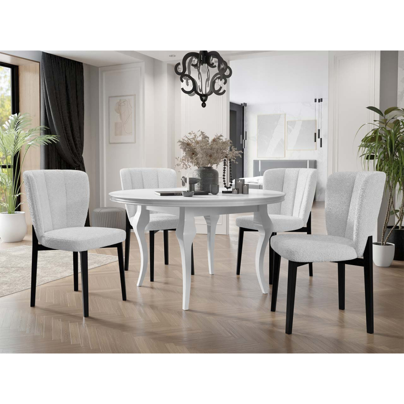Sníte o elegantní jídelně, kde hlavní roli hraje stylový stůl a židle? Pokud ano, určitě si prohlédněte naši nabídku! V hlavní roli je kulatý stůl, jehož konstrukce vychází z nohou inspirovaných stylem Ludwik. Z druhé strany jsou kolem desky stolu ozdobné frézy. Délka stolní desky je 100 cm nebo 140 cm v rozloženém stavu.