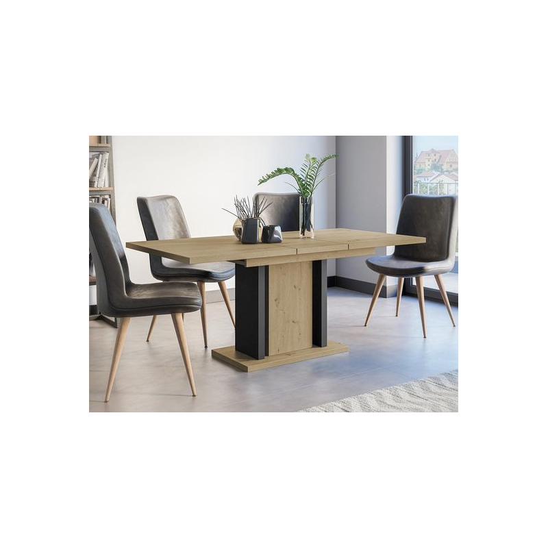 Model je založen na pevném podstavci, který je zdoben dvoubarevnými prvky. Praktická horní deska poskytuje prostor pro několik prostírání i vázu s květinami. Stůl se bude dobře vyjímat jak v moderních interiérech, tak v interiérech s nádechem tradice.