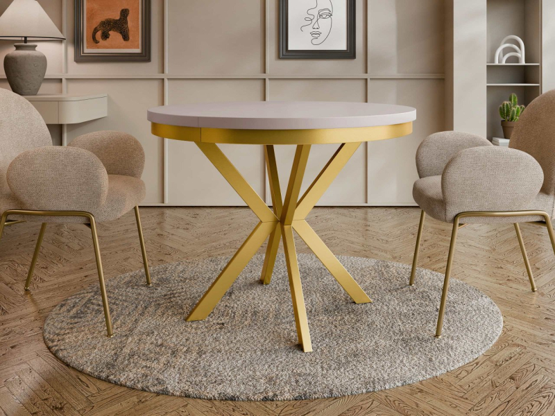 Dekorativní podnoží má zlaté nohy. Rozkládací deska stolu vám díky vložce umožňuje přizpůsobit prostor počtu hostů. Nespornými výhodami tohoto moderního stolu Azglo Złoty 90 jsou jeho dekorativní vzhled a praktické vymoženosti.
