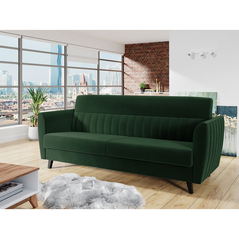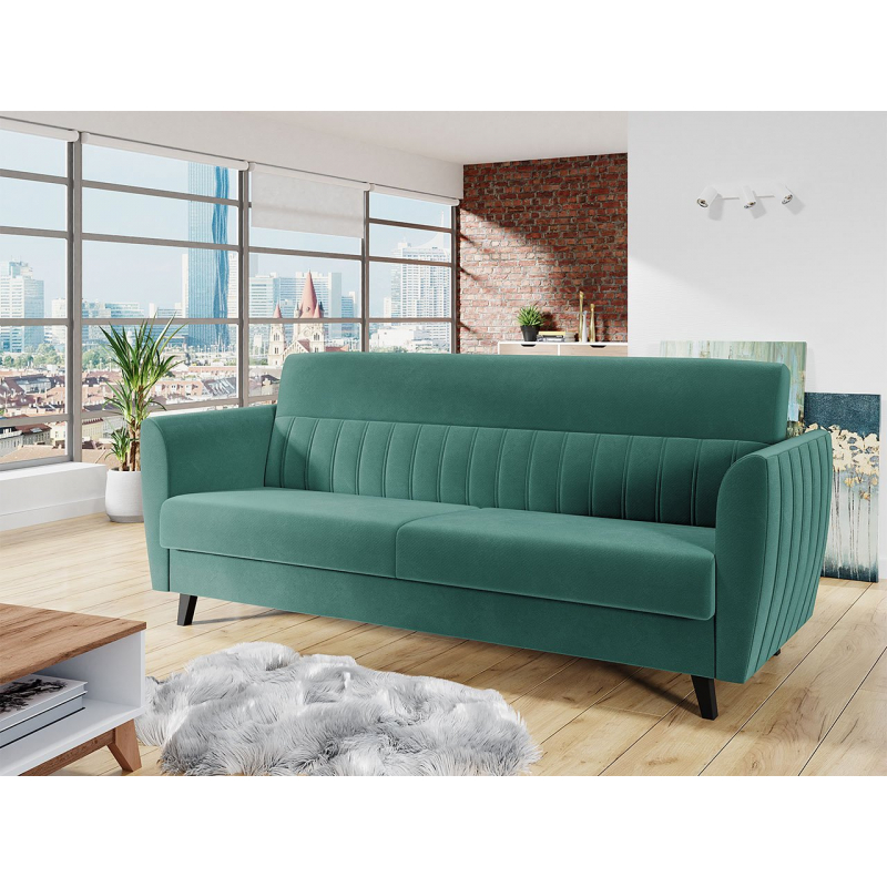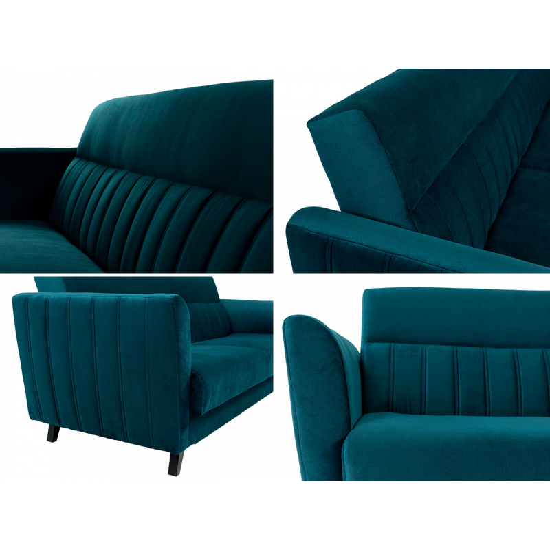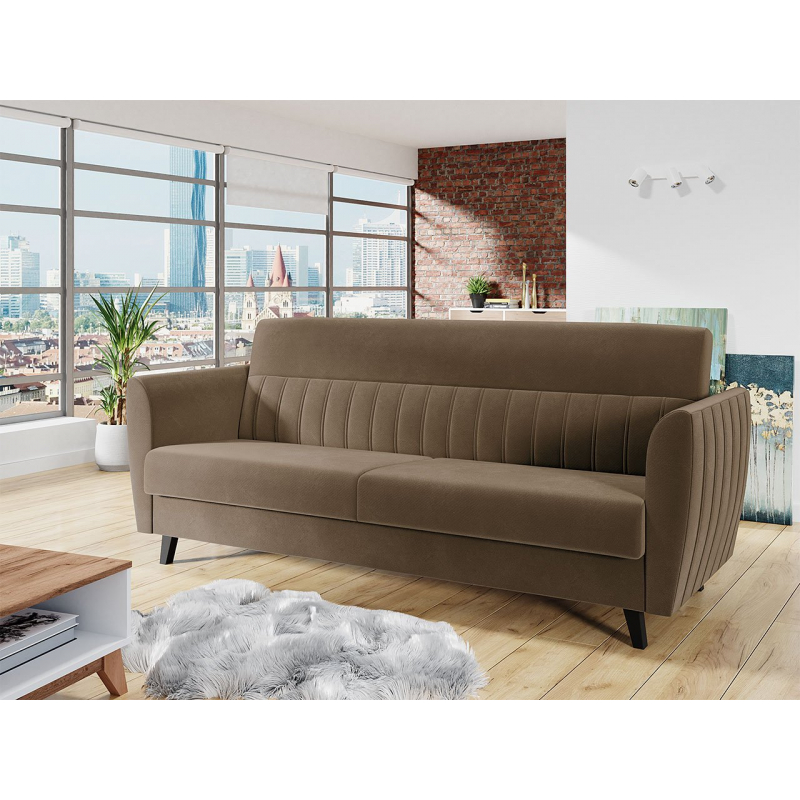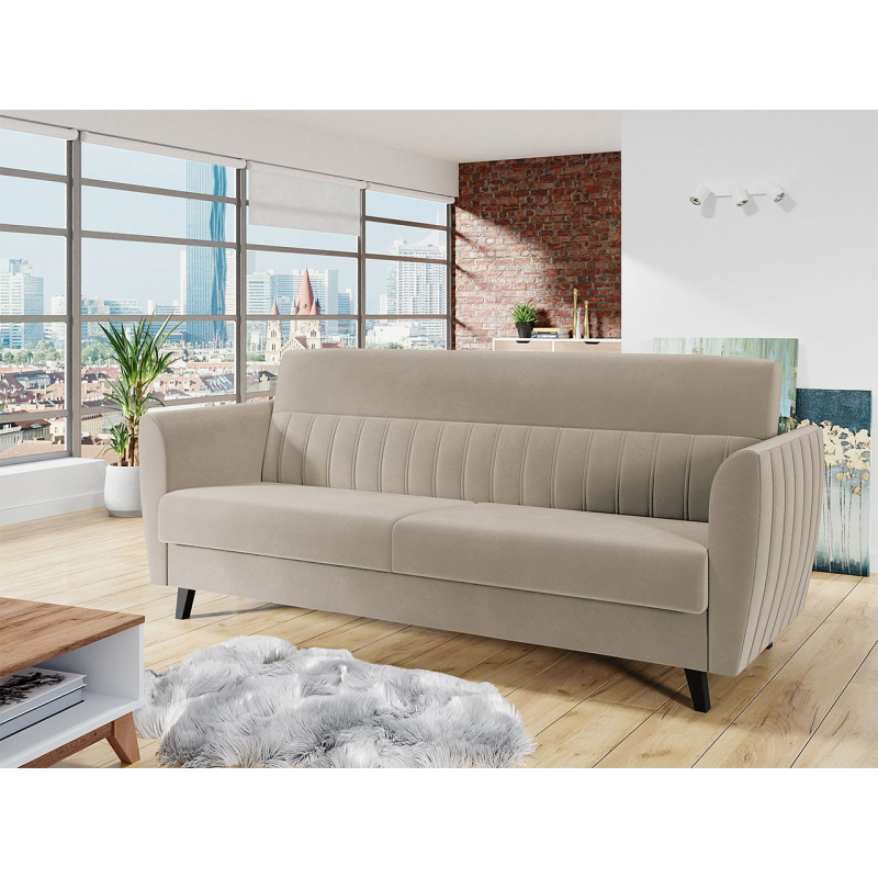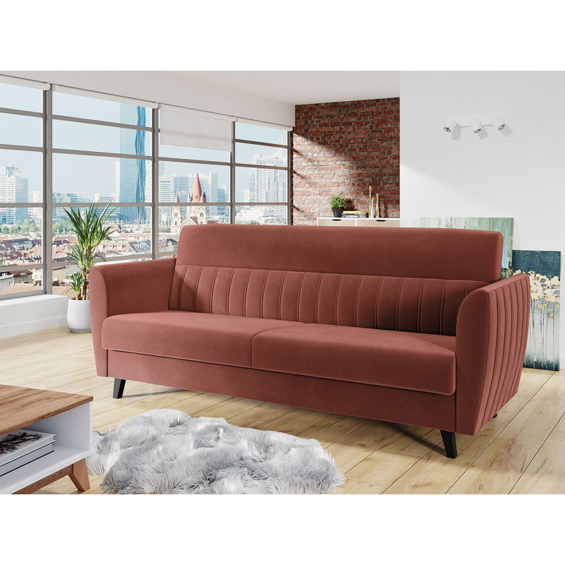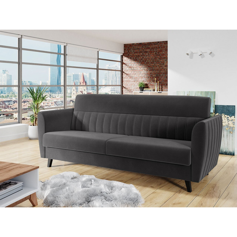 Pohovka Avril je model s ozdobným vertikálním prošíváním, které je umístěno po stranách a částečně na zadní straně. Šití jde dobře s použitou tkaninou, která je měkká a příjemná na dotek. Jednoduchou formu pohovky zdůraznila štíhlá linie dřevěných nohou.