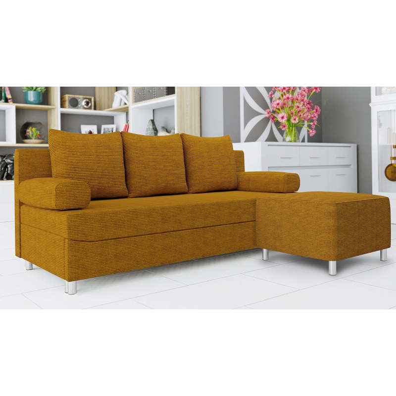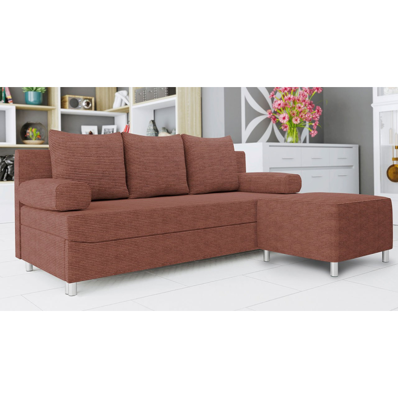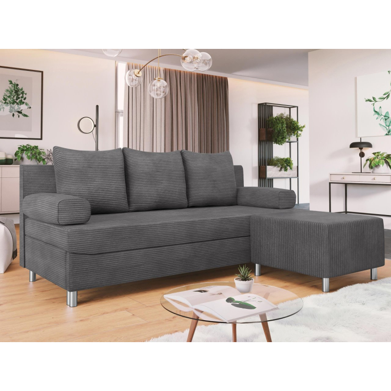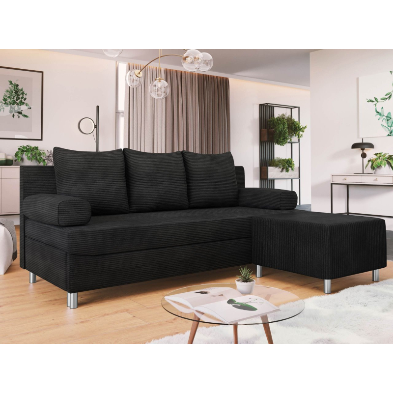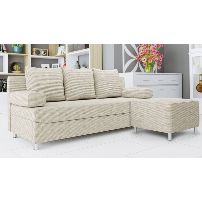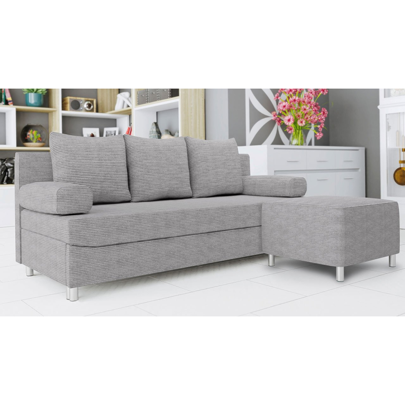 Pohovka je praktický, rozkládací, volně stojící model, který nabízí také spací plochu 192 x 133 cm. Taburet lze použít jako podnožku nebo místo na knihu. Nábytek je vyroben z kvalitních materiálů, obohacený o jemnou a na dotek příjemnou látku. Tato souprava je ideální volbou do moderního obývacího pokoje.