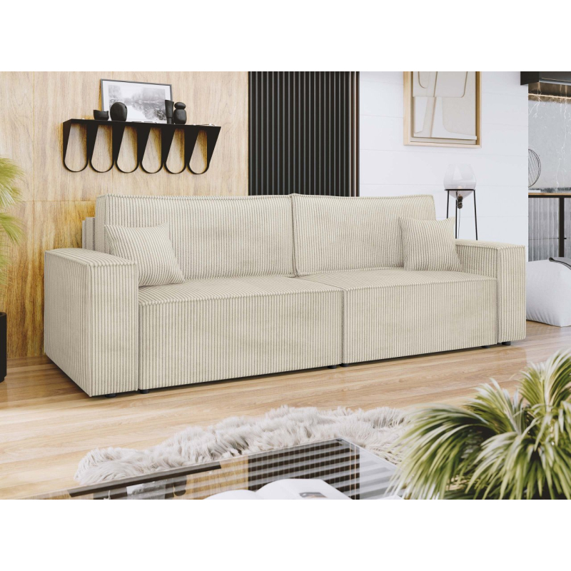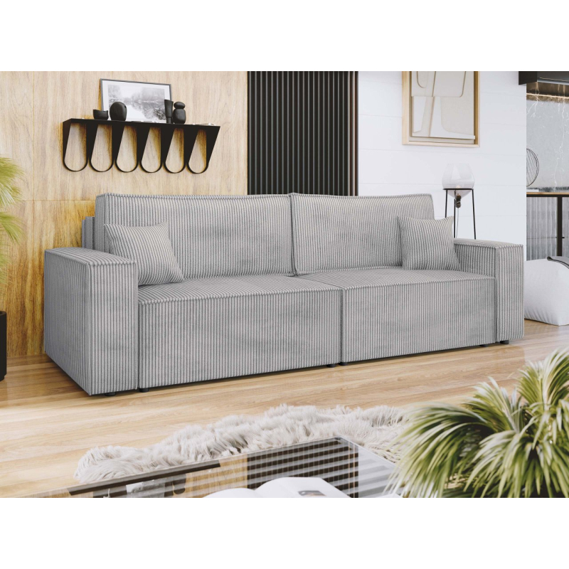 Rozkládací pohovka Kasjusz Sztruks vytváří trendy aranžování! Vyznačuje se jednoduchým minimalistickým stylem, který v kombinaci s pruhovanou látkou dodává obývacímu pokoji moderní akcent, dokonale ladící se současnými trendy interiérového designu.