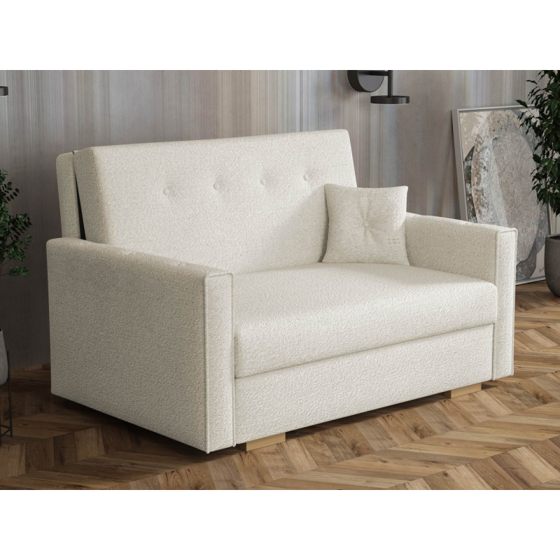 Prezentovaná varianta je jednoduchá forma obohacená o ozdobné knoflíky na opěradle a polštáři. Další výhodou pohovky je její opěradlo čalouněné látkou, což znamená, že tento volně stojící kus nábytku můžete umístit kamkoli v obývacím pokoji nebo dětském prostoru.