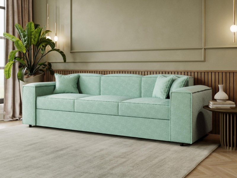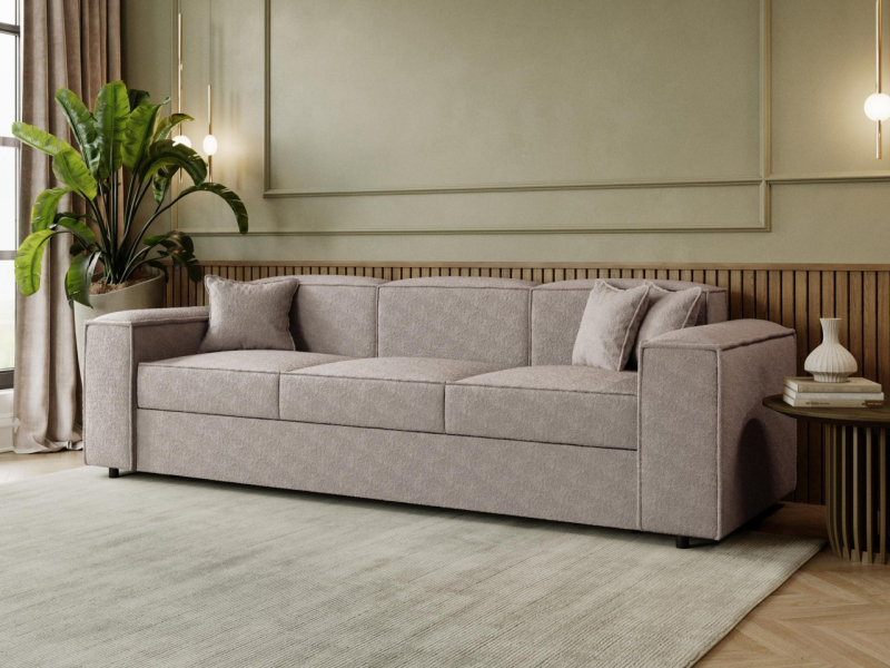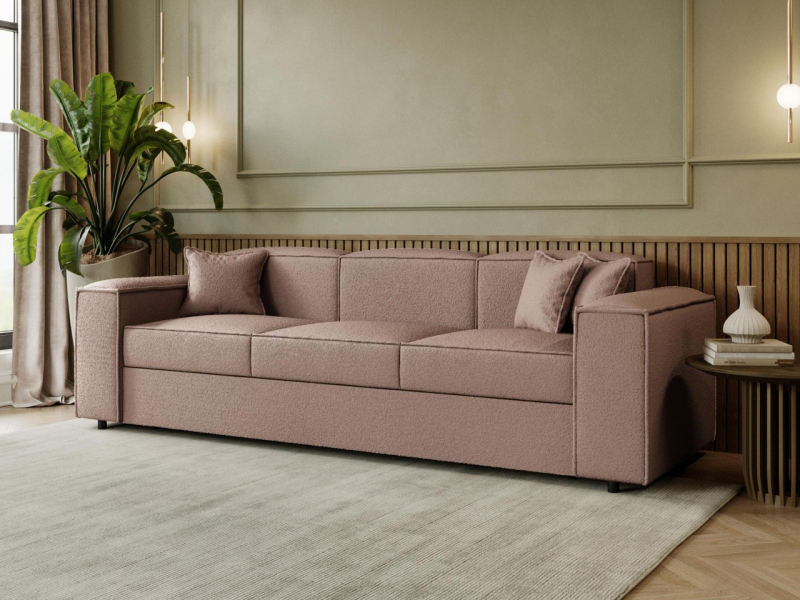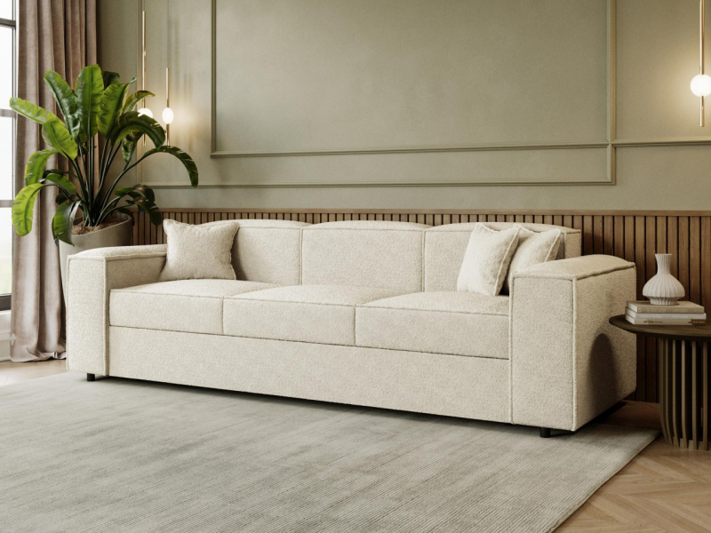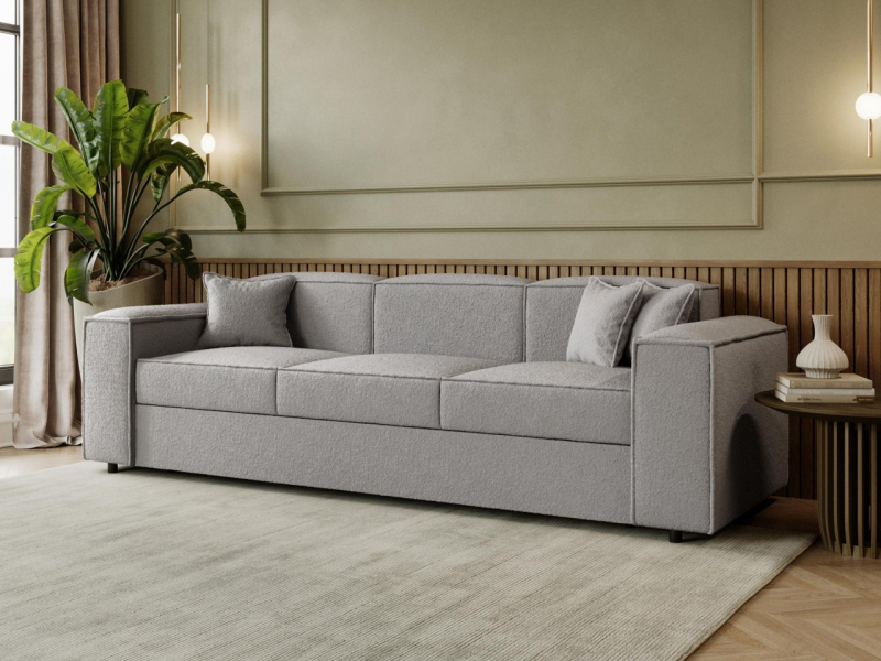 Třímístná pohovka Sokoz Boucle dodá interiéru vašeho domova klasický šarm. Její minimalistický design je synonymem pořádku a harmonie – zvyšuje estetickou přitažlivost obývací části. Jemné lemování zdůrazňuje geometrický tvar sedáku, opěradla a bočnic a dodává tak nádech dynamiky.