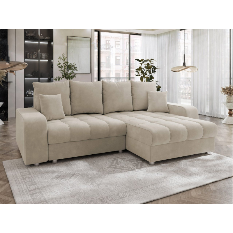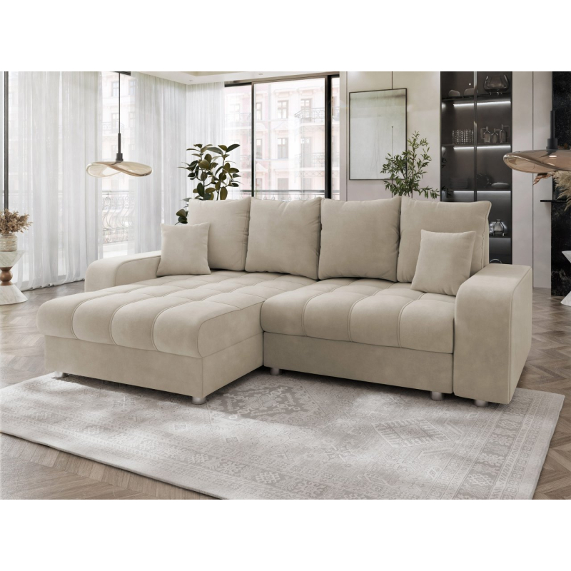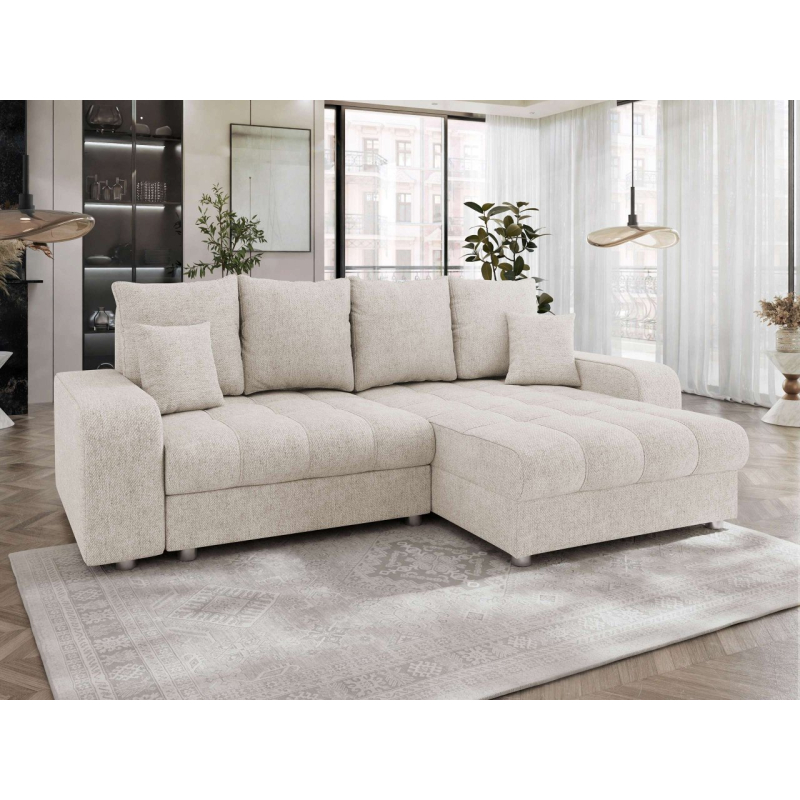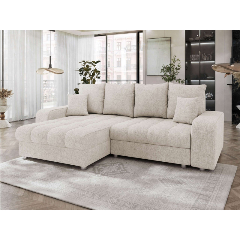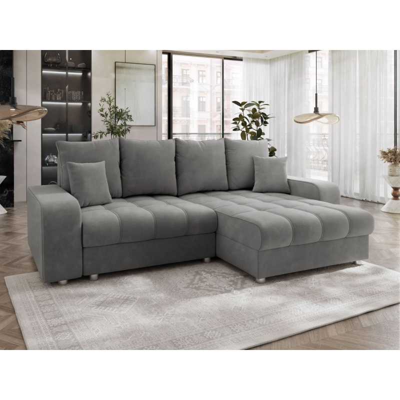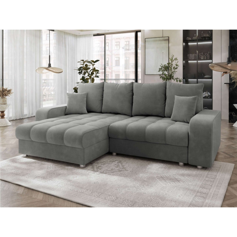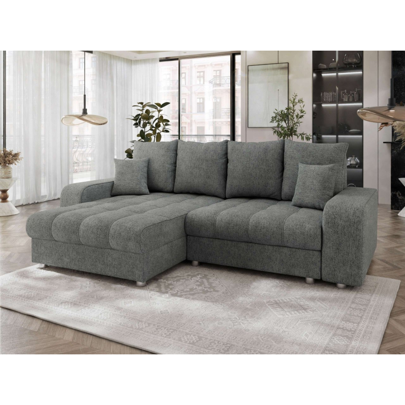 Rohová sedačka do obývacího pokoje Nelwe nabízí styl, který osloví každého uživatele. Jednoduchý tvar byl obohacen o ozdobné prošívání na sedadle. Opěradlo ve formě pohyblivých polštářů je mimořádně měkké a pohodlné. Rozkládací rohová sedačka vytváří ideální podmínky pro denní i noční odpočinek.