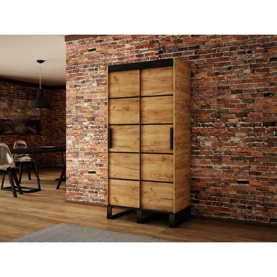 Šatní skříň Willow V1 100 cm je model, který je vyroben z vysoce kvalitních součástí a odkazuje na jeho průmyslový styl. Tento charakter nábytku je ovlivněn takovými detaily, jako je teplá barva front, minimalistické rukojeti z bukového dřeva a kovové nohy s jednoduchým tvarem. Na přední straně skříně jsou navíc ozdobné vodorovné čáry v kontrastní barvě. Do skříně se můžeme podívat díky posuvným dveřím, které se pohybují po vodicích lištách systému „MINI“ „BIMAK“ - ovlivňují jejich tichý a snadný provoz. Uprostřed skříně jsou regály na věšáky, prostorné police a dvě zásuvky.