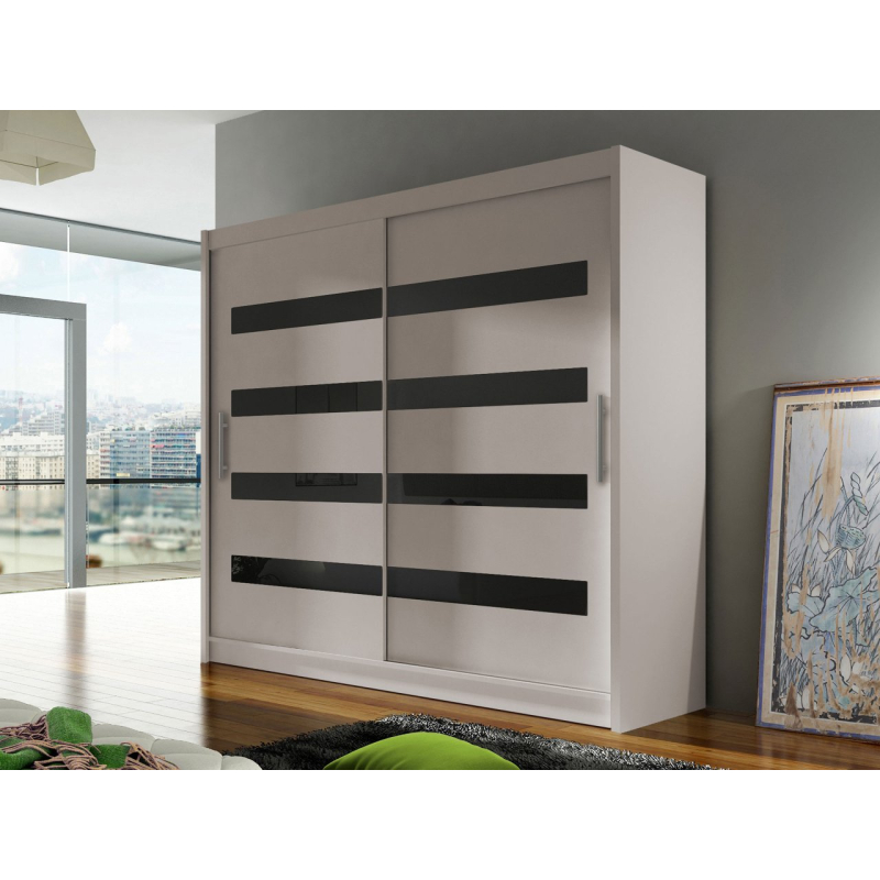 Tento šatník má na čelních stěnách charakteristické skleněné vložky, takže je ideální pro klasický i moderní design interiéru. Byla vyrobena z laminované desky, jejíž okraje byly zakončeny dýhou ABS, což poskytuje vysokou kvalitu a zajišťuje bezpečnost při používání.
